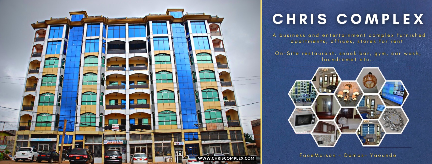 Chris Complex est un complexe d'affaires et de loisirs appartements meublés, bureaux, commerces à louer. Chris Complex est un endroit idéal pour travailler ou se détendre à Yaoundé, avec une sécurité 24h / 24, des divertissements et des équipements de travail comme un centre d'affaires et un jardin sur le toit avec cuisine et vue panoramique sur la ville. Des écrans intelligents de 65 pouces sont également disponibles avec toutes les principales applications de streaming et plus de 300 chaînes câblées des États-Unis, d'Europe, d'Asie et d'Afrique. Chris Complex dispose essentiellement de toutes les commodités d'un hôtel, y compris sur place : snack-bar lounge avec bar complet, restaurant à service complet, lave-auto, salle de sport, centre d'affaires.