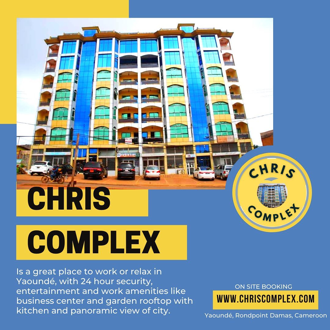 Chris Complex est un endroit idéal pour travailler ou se détendre à Yaoundé, avec une sécurité 24h/24, des divertissements et des équipements de travail comme un centre d'affaires et un jardin sur le toit avec cuisine et vue panoramique sur la ville. Des écrans intelligents de 65 pouces sont également disponibles avec toutes les principales applications de streaming et plus de 300 chaînes câblées des États-Unis, d'Europe, d'Asie et d'Afrique. Chris Complex dispose essentiellement de toutes les commodités d'un hôtel, y compris sur place : snack-bar lounge avec bar complet, restaurant à service complet, lave-auto, salle de sport, centre d'affaires. Le bâtiment est un bâtiment attrayant de 7 étages, sur un grand boulevard commercial avec des lampadaires, donc l'éclairage la nuit et la sécurité sont géniaux.