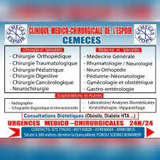 La Clinique Médico Chirurgicale de L'Espoir (CEMECES) est situé à Douala précisément à Sodiko – Bonaberi. La Clinique Médico Chirurgicale de L'Espoir offre des soins en médecine générale, chirurgie générale, pédiatrie, gynécologie, obstétrique, maternité, échographie, chirurgie, dermatologie, laboratoire et des vaccinations.