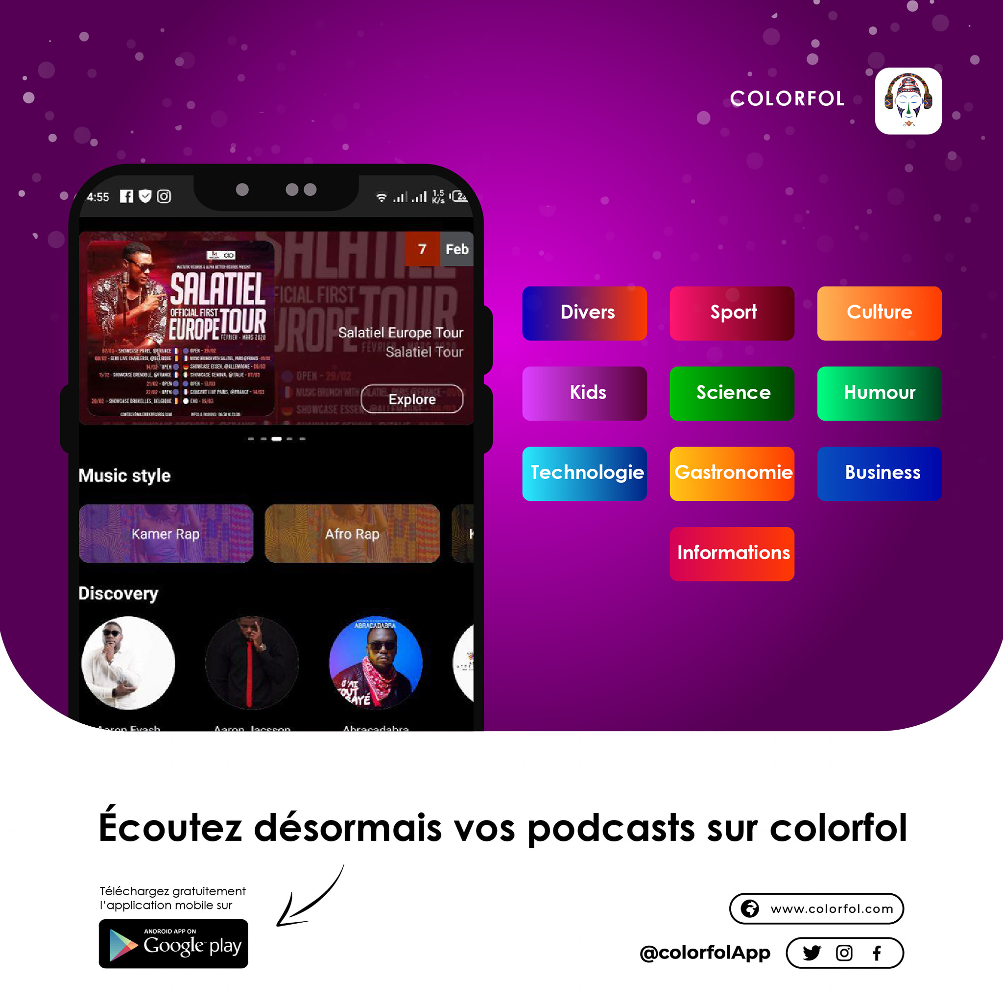 Colorfol est une plate-forme de streaming (audio & video) et de promotion de la musique camerounaise et africaine disponible sur playstore. Retrouvez sur Colorfol, des jeunes et anciens artistes. Streamez en audio et vidéo, partagez et interagissez avec vos artistes préférées. Colorfol répertorie la plupart des événements culturels au Cameroun accessible via notre agenda évènementiel et vous donne la possibilité d'acheter directement vos billets via (MoMo et Orange Money), vivez une expérience musicale sans pareil.