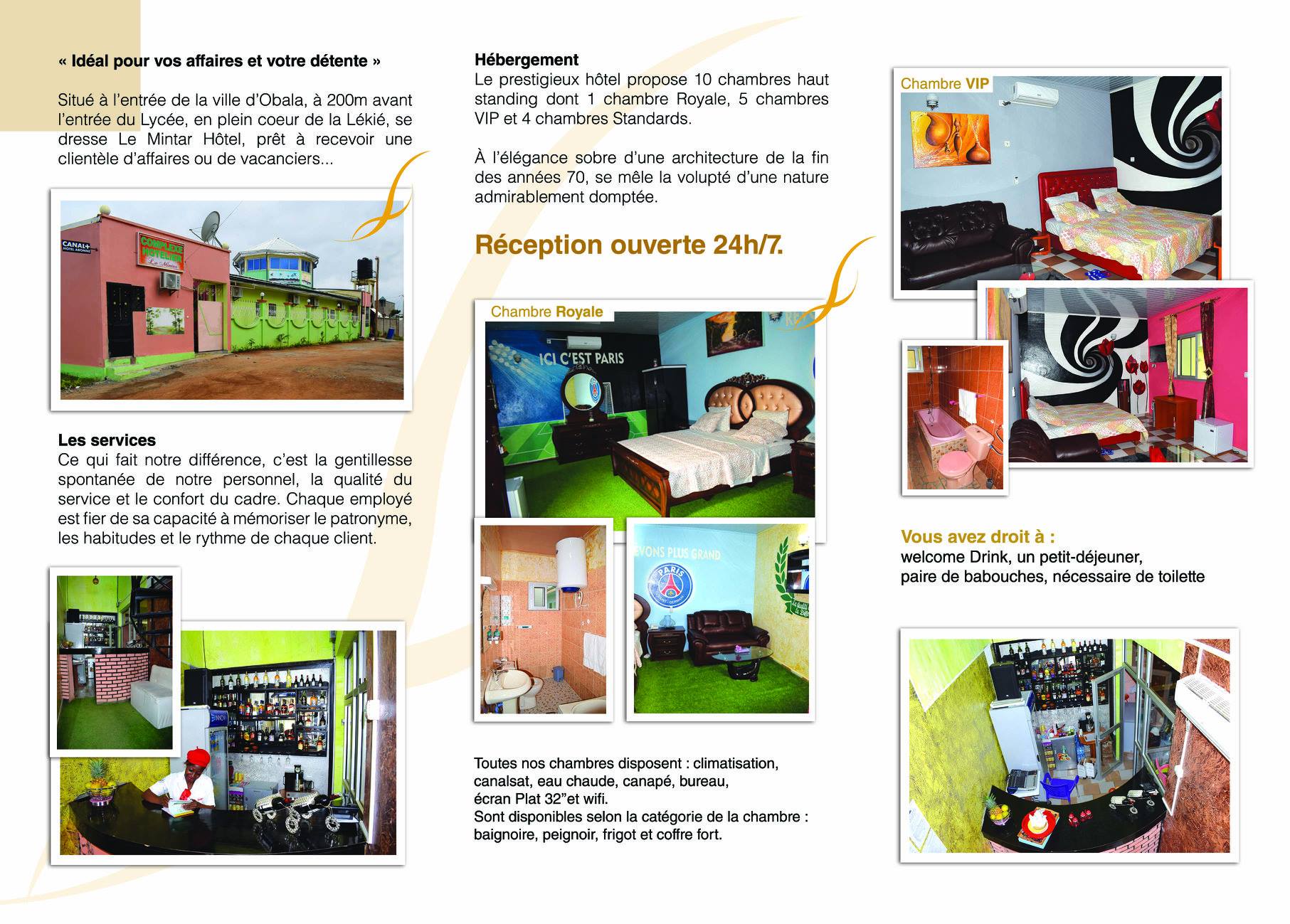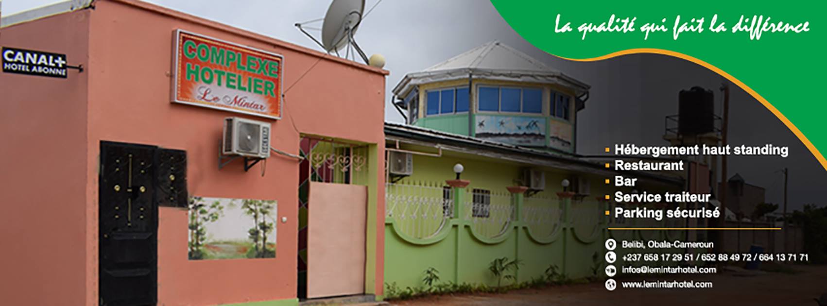Situé à l’entrée de la ville d’Obala, en plein cœur de la Lékié, se dresse le Complexe Hôtelier Le Mintar, prêt à recevoir une clientèle d’affaires ou de vacanciers. Il propose à sa clientèle des chambres haut standing, un bar et un restaurant. Le restaurant du Mintar Hôtel vous propose de la cuisine locale (crevettes, vipères, grillades, légumes, etc.) mais aussi de la cuisine française.