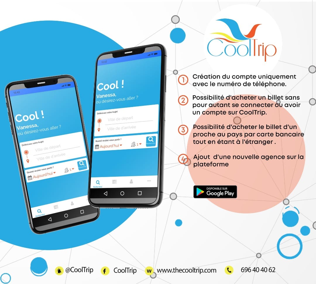 CoolTrip est la plateforme de réservation et d’achat des billets de bus en ligne via www.thecooltrip.com. CoolTrip dispose aussi d’une application disponible sur Play store.