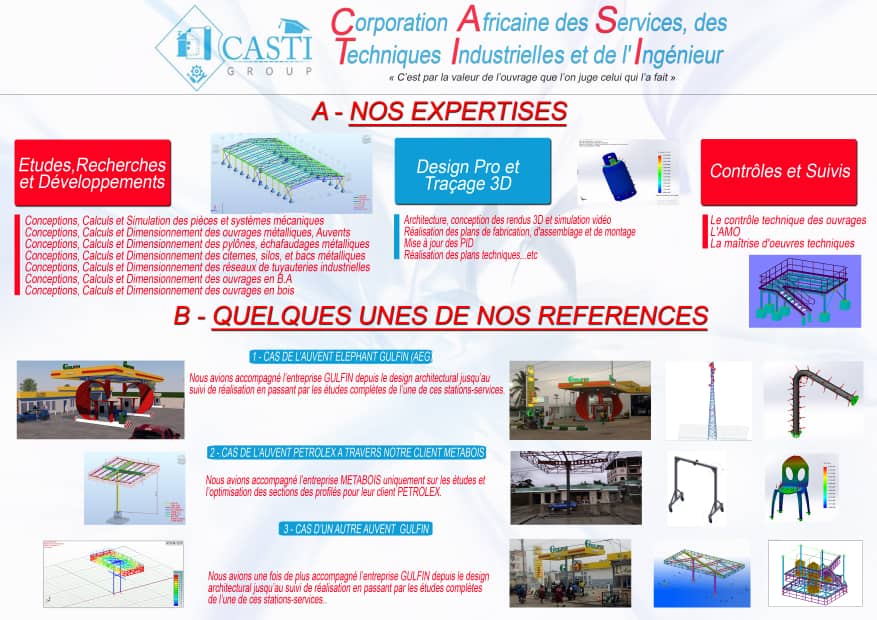 La Corporation Africaine de Services, des Techniques Industrielles et de l’Ingénieur en abrégé « CASTI Group » est une nouvelle plateforme technique exerçante dans la sous-région et proposant des services dans le domaine des études (CASTI Technologies), de la formation professionnelle (CASTI Academy) et dans le placement du personnel (CASTI Services). C'est une entreprise constituée d’ingénieurs conseils, intervenant en Afrique centrale et au Cameroun en particulier. CASTI GROUP est aujourd’hui une société de référence dans le secteur de l’ingénierie grâce au travail et à la foi de ses pionniers qui ont porté ce projet audacieux. Nous avons le souci de mettre nos compétences dans les études et le suivi de nombreux projets pour le compte des particuliers, des entreprises privées et publiques. Ainsi, faire confiance à CASTI GROUP c’est confier vos projets aux mains des ingénieurs professionnels qui ont su transformer une idée, un concept en quelque chose de tangible et concret. Ainsi, pour tous vos projets de construction Privée, Industriel, Tertiaire, Oil & gaz, de réhabilitation des structures de bâtiments industriels, le Bureau d'Etudes Technique (BET) d’ingénierie CASTI Technologies (Branche de CASTI GROUP) met à votre disposition ses services en Conception, Études, Suivi et Maitrise d'œuvre.