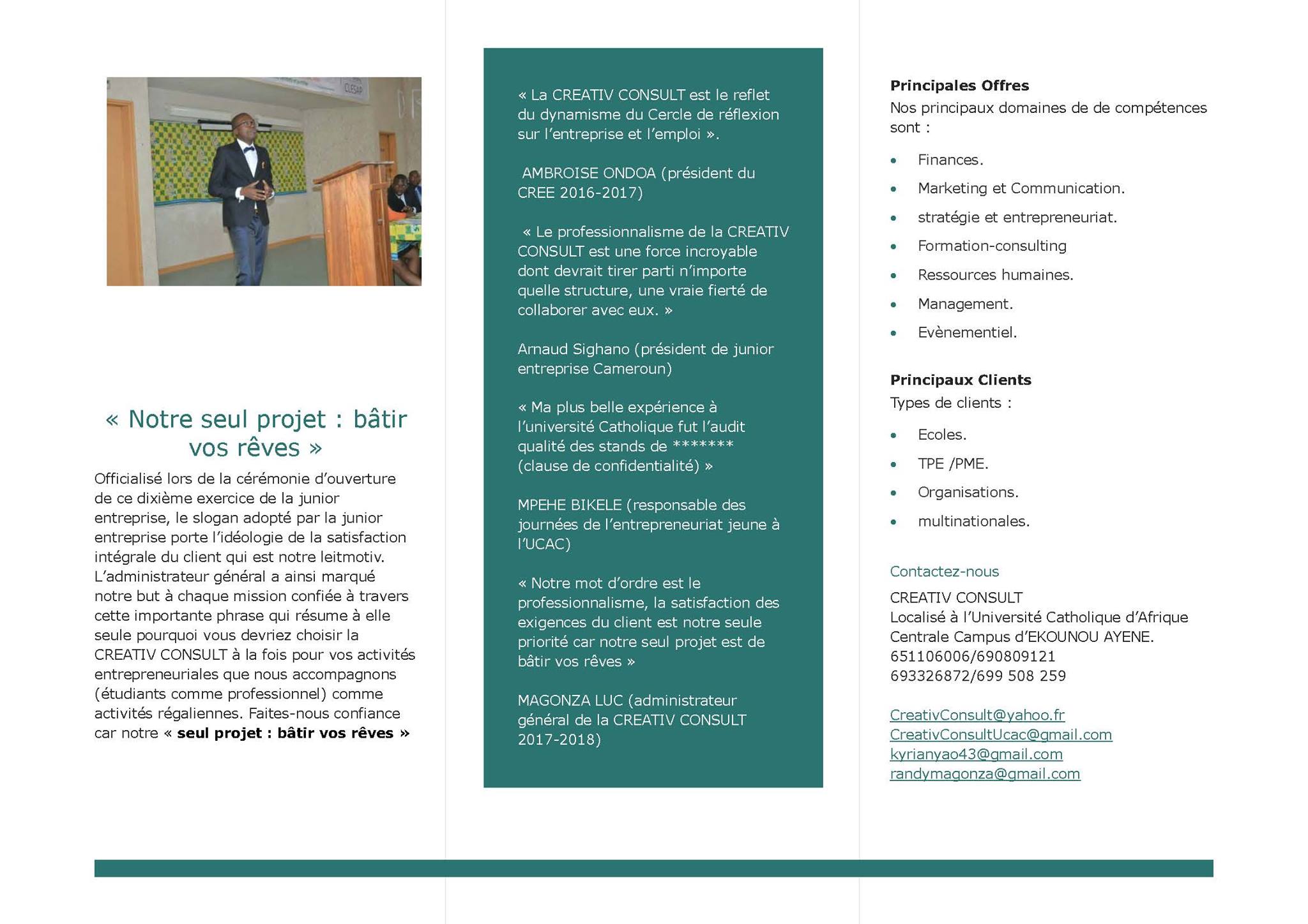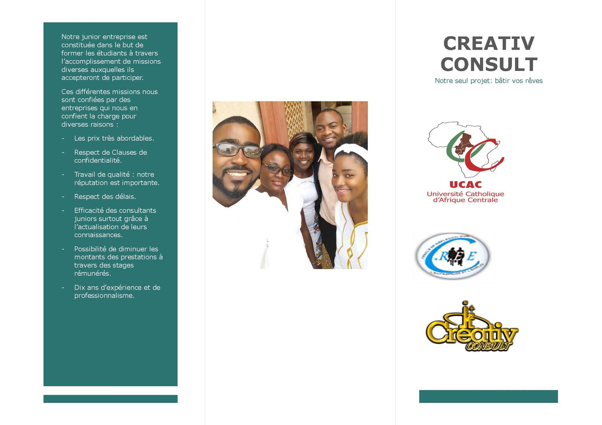 Creativ Consult est une junior entreprise de l'UCAC (Université Catholique d’Afrique Centrale) sous la responsabilité du Cercle de Réflexion sur l'Entreprise et l'Emploi (CREE). A l'université Catholique, la Creativ Consult est reconnue pour son dynamisme et son savoir-faire. Bien que ce soit des étudiants qui ont les pleins pouvoirs, elle forme sur les articulations diverses et domaines variés des étudiants en les confrontant au monde professionnel à travers une approche plus pragmatique et moins théorique de l'entrepreneuriat.