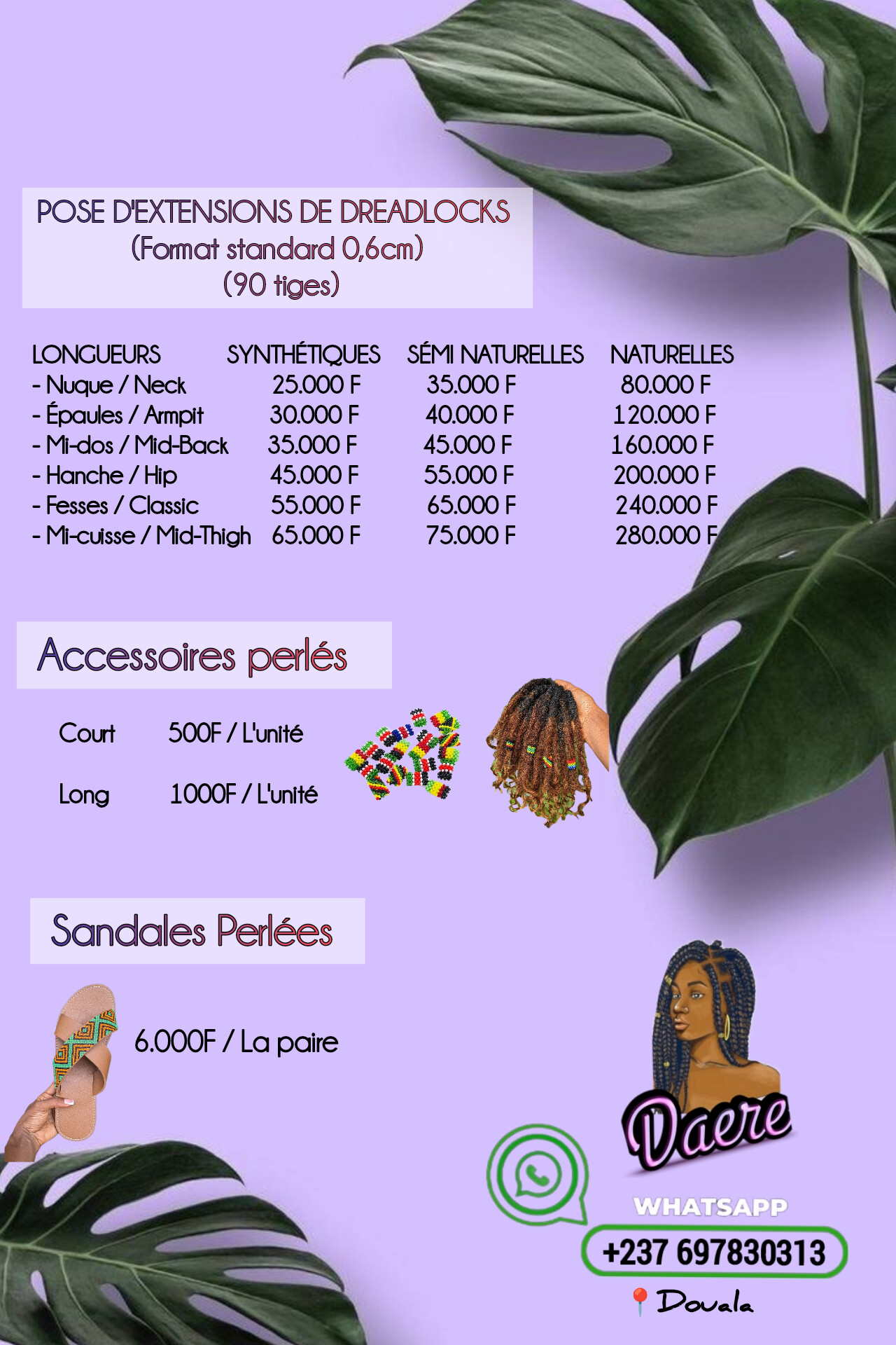 Daere Locks propose des services à domicile en confection, vente et pose d'extensions de locks, ainsi que d'accessoires perlés faits main pour embellir vos locks et tresses. Daere est également le nom d'une collection de sandales en simili perlées. Daere Locks est basée à Douala au quartier Bonamoussadi.