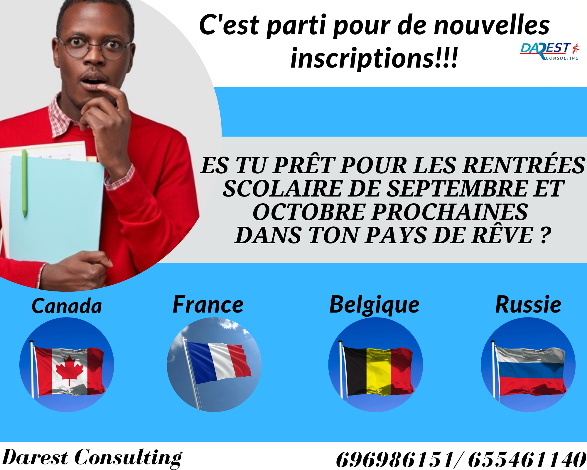 Darest Consulting est un cabinet conseil spécialisé dans l’accompagnement et l’orientation pour des voyages d’étude, de travail et de loisir à l’étranger. Sa mission principale est de mettre à disposition de ses étudiants les différentes offres suivantes : Accompagnement dans les procédures de voyage, recherche d'écoles en France, coaching d'admission dans les universités à l’étranger, orientation scolaire, aide au logement à l’étranger, aide au traitement en ligne du dossier campus France, facilitation de visa, vente des billets d'avion, accueil à l’étranger, placement pour stage. Nous sommes respectivement basés dans les villes de Douala et Yaoundé.
