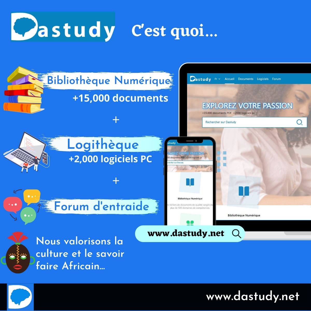 Dastudy est une plateforme de E-learning qui a pour but de faciliter l'accès à la connaissance de qualité pour développer des compétences pratiques, en fournissant une grande diversité de documents, logiciels. Dastudy offre une solution innovante aux problèmes d’accès à la connaissance et de mise en avant du savoir local. Dastudy facilite le partage de connaissance entre enseignants, professionnels et apprenants par un contenu éducatifs (documents, livres, forum d'entraide) dans les domaines académique, professionnels et culturels (agronomie, informatique, entreprenariat, cuisine, apprentissage des langues locales...).