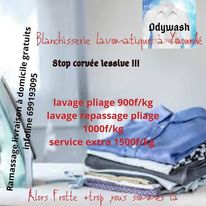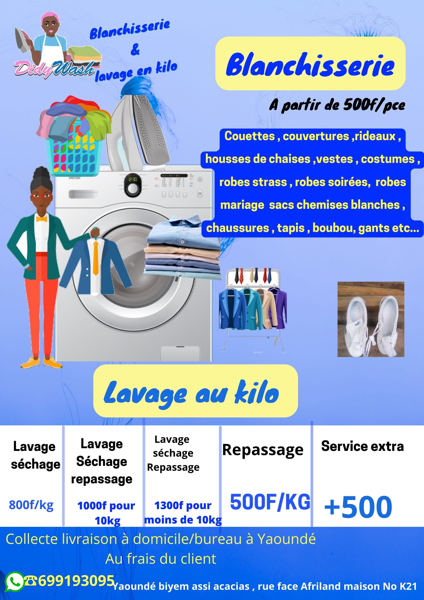 Didy Wash est une blanchisserie basé à Yaoundé. Elle propose des services de ramassage, nettoyage, , Séchage, Repassage et livraison du linge. Les prestations sont facturées au kilo.