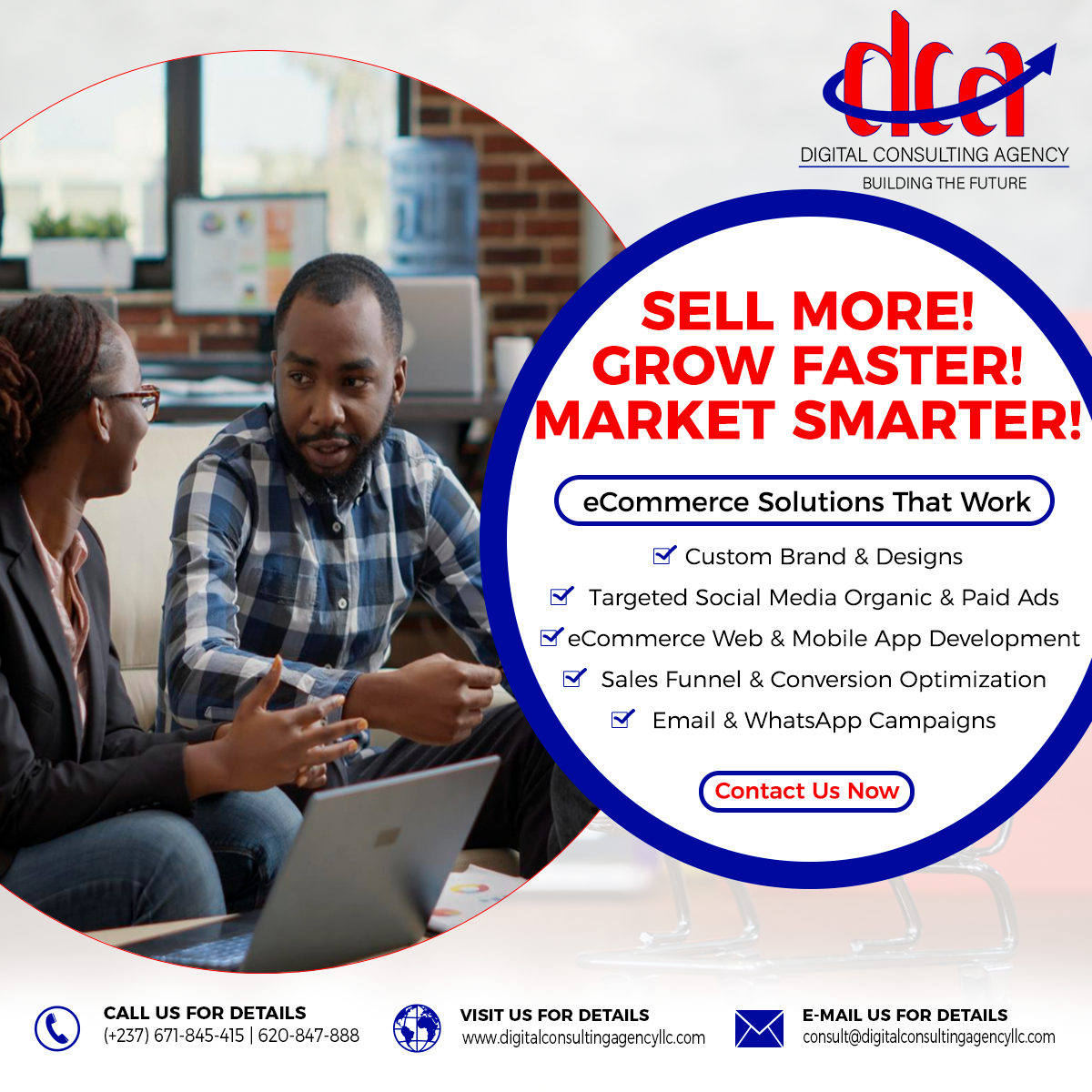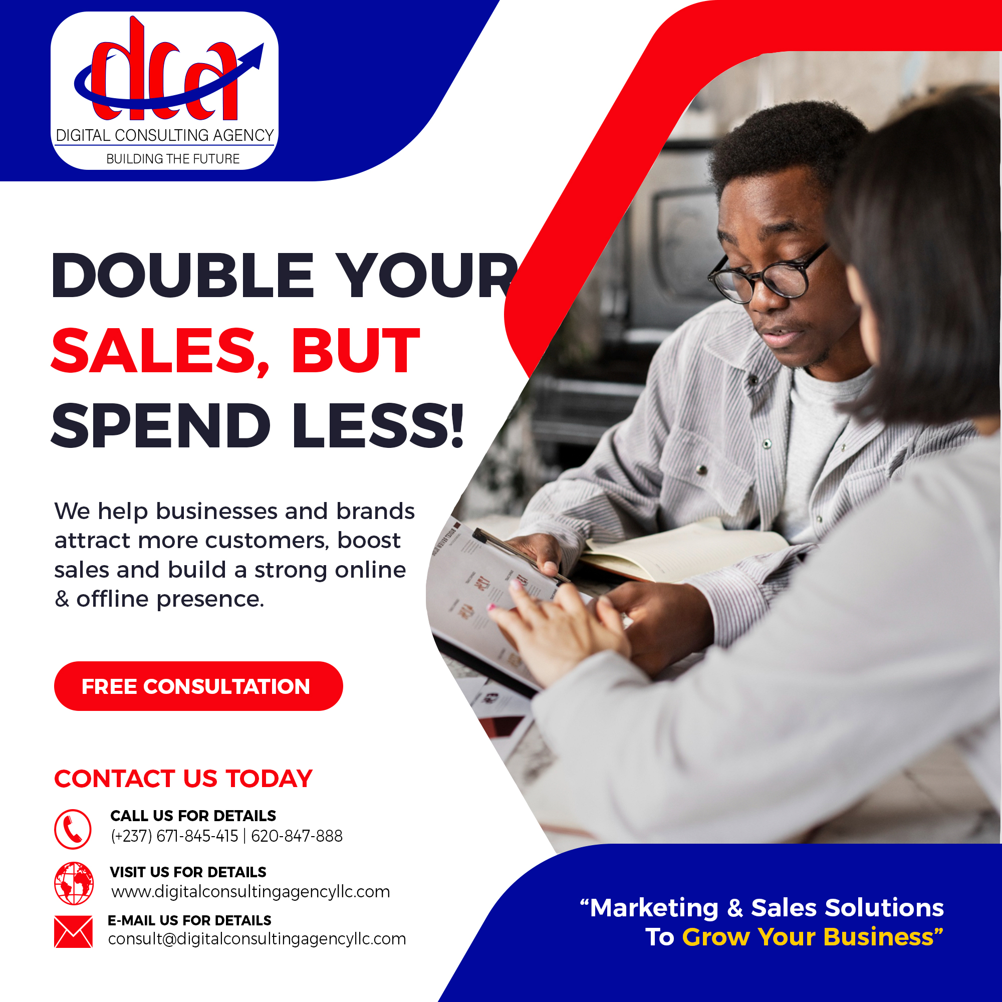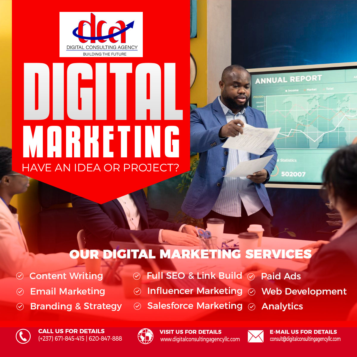 Digital Consulting Agency is one of the pioneer digital marketing, business consulting, IT Solutions and international certification training agency in Central Africa, that you can trust to help you setup and take your business to the next level. DCA offers a hierarchy of services for clients needs from branding and awareness to performance marketing and setting up your business strategies for steady growth. Digital Consulting Agency also focusses on providing optimal internationally recognized standard education, certification, and certificate programs for individuals and organizations on a wide range. We show commitment and competence by providing you with valuable education, evaluation, certification, and certificate programs against internationally recognized standards. Our agency vision is to build a future that is 100% Success guaranteed for your business. DCA is open to work in with any level organization from small, medium to large. We provide multiple top tier projects from Web/App Development, your business strategies, software programming, graphics design, digital marketing, digital/onsite sales and many more… We have a full team of first class competent and professionally certified members who each have specific task to carry out in every project. Our main objective for each of our client is to make sure their satisfaction is obtained at all cost, and also to make them the top leader in their various areas of services.