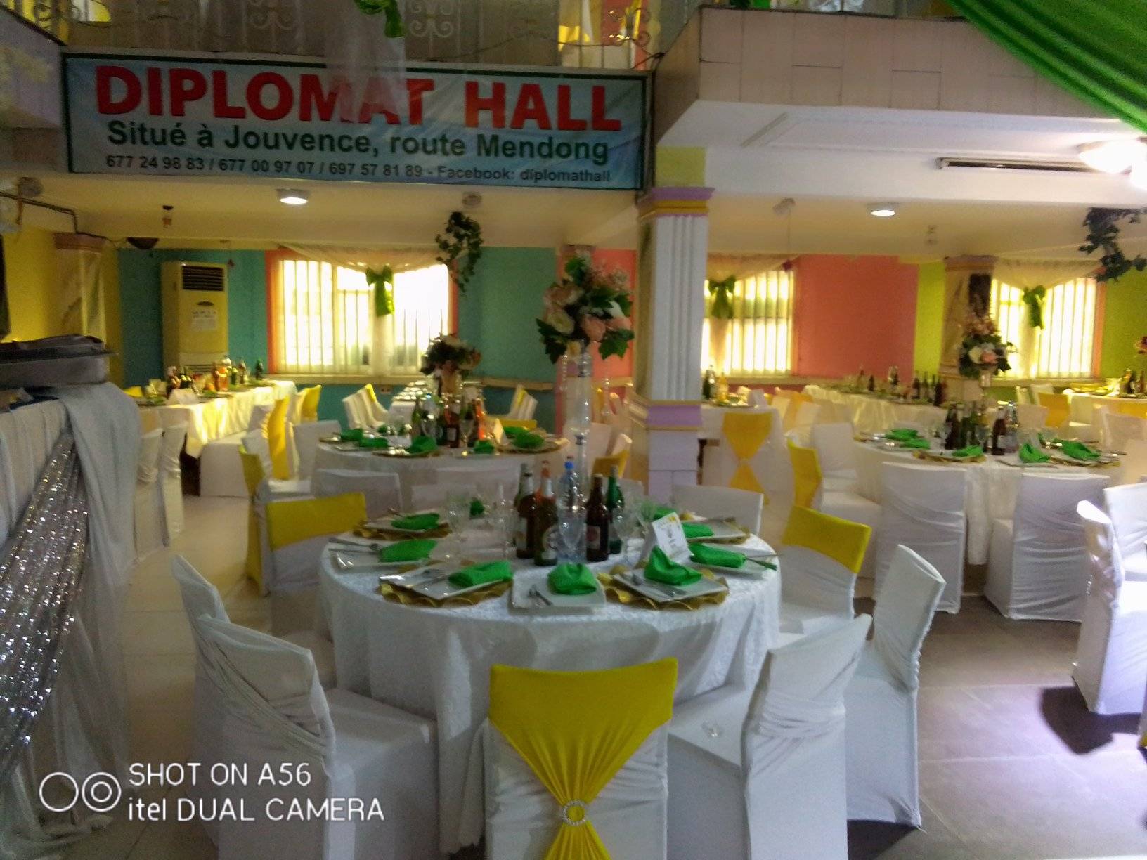 Diplomat Hall est une salle de cérémonies VIP d'une capacité d'accueil de 500 places assises située à Jouvence Route Mendong à Yaoundé. Diplomat Hall est une salle de fête de nouvelle génération pour des événements exceptionnels et uniques.