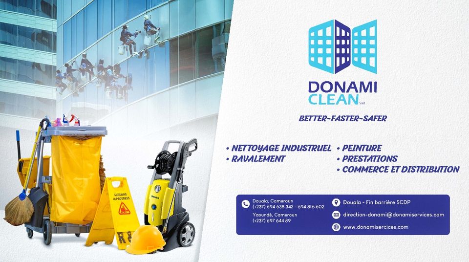 Donami Clean Sarl est une entreprise spécialisée dans les prestations de services de nettoyage industriel (espace professionnel et domestique), de nettoyage, entretien en hauteur des façades et surfaces lisses, la commercialisation des produits d’entretien (Magic K), de nettoyage et de protection des matériaux. Dans le but d’apporter des solutions innovantes issues des technologies durables et de qualité dans des conditions optimales de sécurité. Donami Clean se donne pour mission la mise en place des moyens et mesures nécessaires pour la satisfaction de ses clients, tout en respectant les exigences réglementaires applicables à ses activités.
