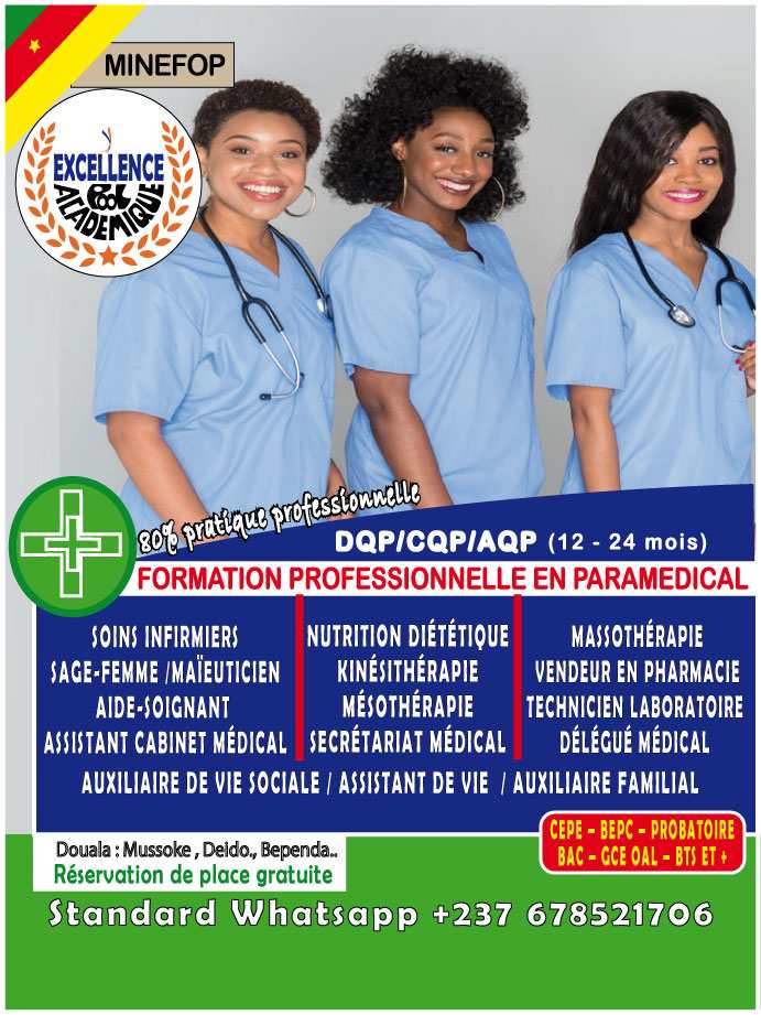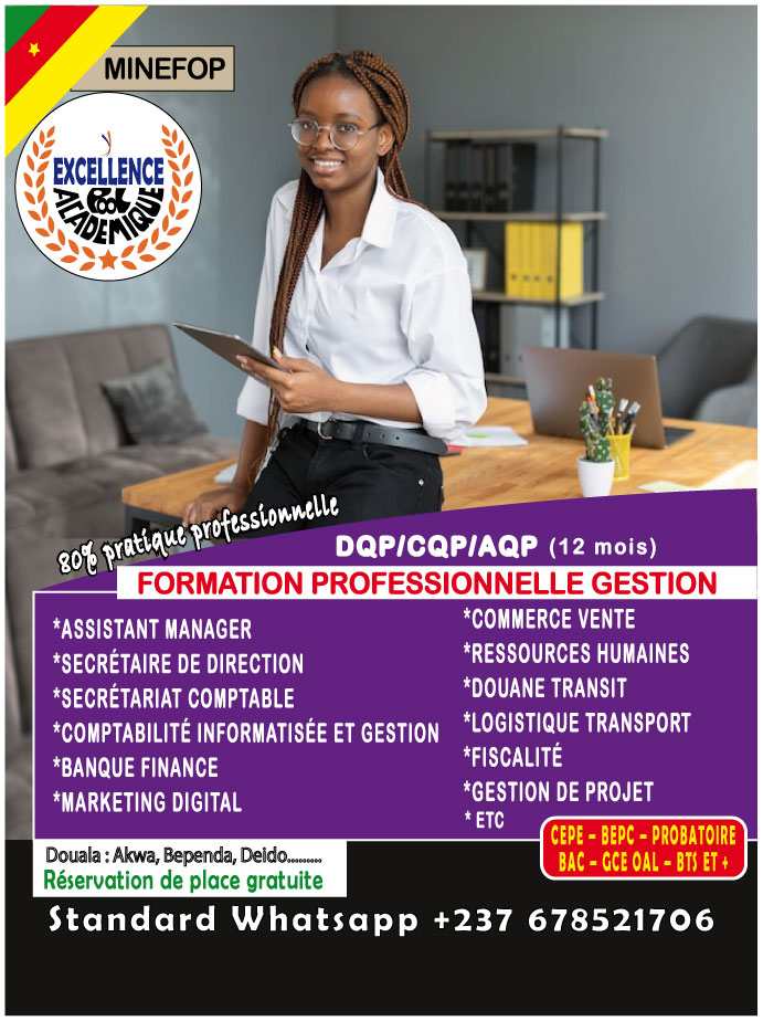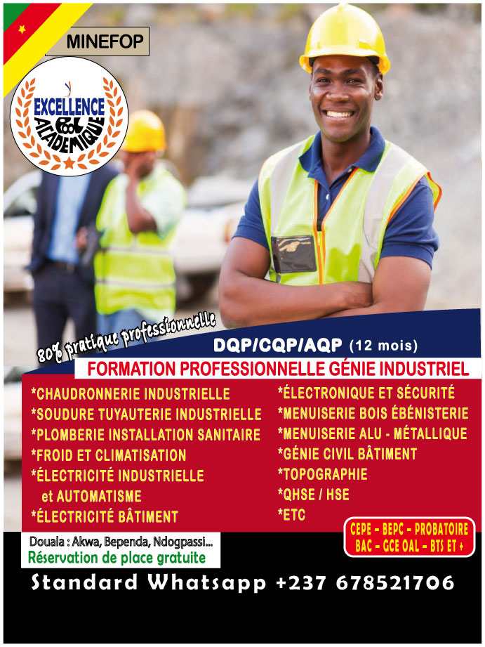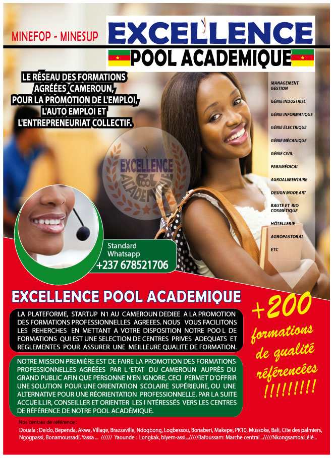EXCELLENCE POOL ACADÉMIQUE est une plateforme de promotion dédiée à la promotion des formations professionnelles agréées MINEFOP/MINESUP au Cameroun. Nous facilitons les recherches en mettant à disposition auprès des intéressés une sélection de meilleurs centres, écoles, instituts privés professionnels et/ou supérieurs adéquats et réglementés, pour leurs assurer une meilleure qualité de formation. Notre cadre d'accueil, de conseils et d'orientation est ouvert à toutes personnes désireuses de poursuivre des études supérieures, ou d'acquérir des connaissances professionnelles pour une reconversion dans une nouvelle activité. EXCELLENCE POOL ACADÉMIQUE évolue dans plusieurs domaines de formations: - GÉNIE INDUSTRIEL - GÉNIE MÉCANIQUE AUTO ET ENGIN LOURD - GÉNIE CIVIL BTP - MÉTIERS BOIS - GÉNIE INFORMATIQUE - SANTÉ ET PARAMÉDICAL - MANAGEMENT ET GESTION - BEAUTÉ, ARTISANAT, MODE ET DESIGN - HÔTELLERIE ET RESTAURATION - AGRO-PASTORALE ET AGROALIMENTAIRE - CONDUITE ENGINS LOURDS - CERTIFICATIONS Et plus de 200 formations 💯 pratiques disponibles pour vous.