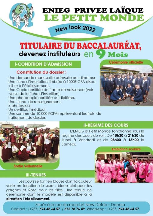 L’Enieg Privée Laïque Le Petit Monde est un centre de formation des instituteurs d’enseignement primaire. L’Enieg Le Petit Monde fonctionne sous le régime des cours du soir. De 15h30 à 21h30 de Lundi à vendredi et de 08h à 13h le Samedi. Les cours se font en blouse dont la couleur varie selon le sexe : bleue ciel pour les garçons et rose pour les filles.