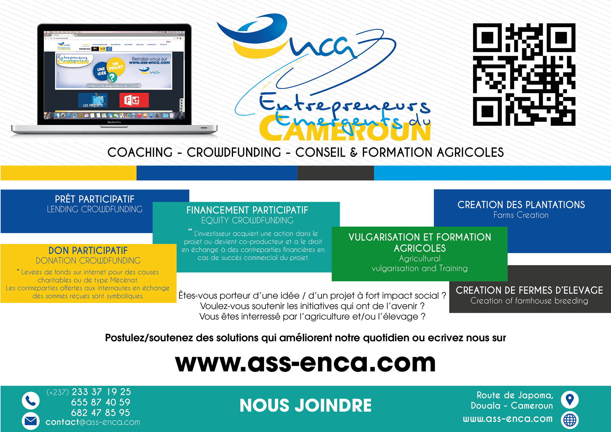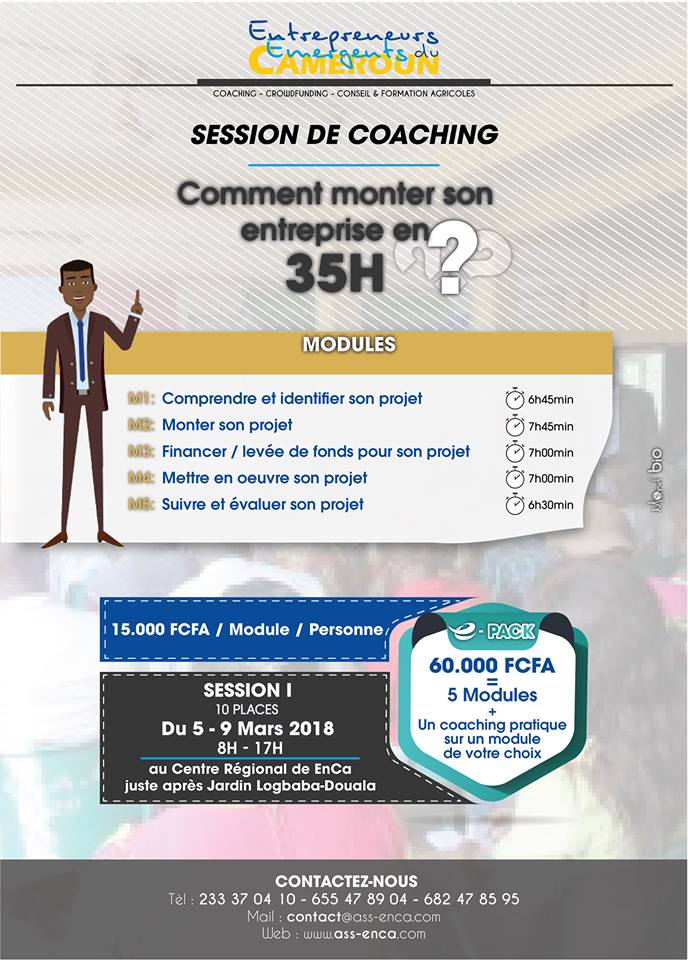 Entrepreneurs Emergents du Cameroun en abrégé « EnCa » est une structure associative créée suivant l’arrêté préfectoral n°630/2017/RDA/C19/SAAJP. EnCa est une plateforme de COACHING - CROWDFUNDING - CONSEIL ET FORMATION AGRICOLES qui aide les promoteurs de start-up et agriculteurs à collecter des fonds (start-up) pour réaliser leurs idées ou leurs projets. Ainsi, EnCa a pour but de soutenir les idées ou les projets qui façonneront notre futur au-delà des tendances imposées et d’accompagner les agriculteurs avec notre expertise.