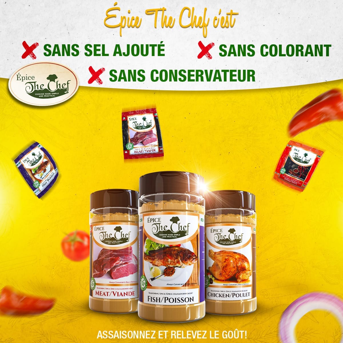 Epice The Chef est une entreprise qui produit des épices d’assaisonnement pour repas, ragout et rôti. Nous vous proposons de savoureux mélanges d'épices à utiliser pour assaisonner vos repas et relever le goût de tous vos plats. Très facile à utiliser, garantie sans sel, sans conservateurs et sans colorants.