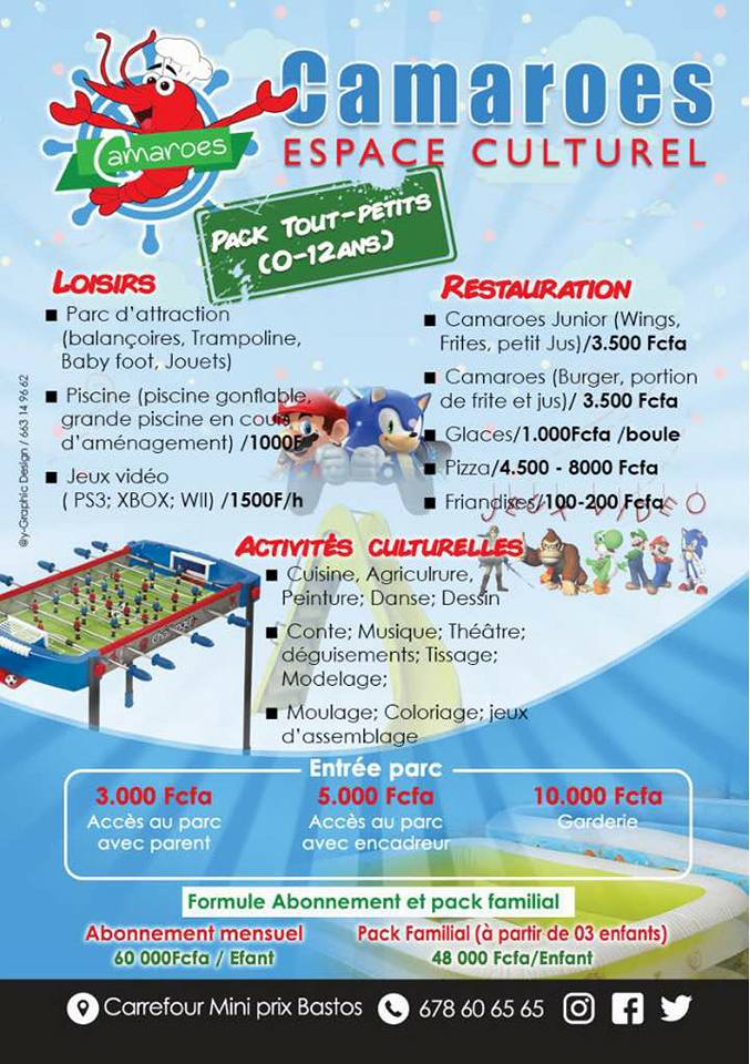 Espace Culturel Camaroes est un centre de récréation et détente pour enfant et adultes. Notre cadre est un espace aéré de 3200 m2 à la disposition de nos clients pour un moment de divertissement familiale. Il possède aussi des espaces privatisés disponible pour l’organisation d’évènements professionnels ou familiaux. Le Camaroes c'est aussi un restaurant avec des buffets à bas prix. L'Espace Culturel Camaroes est situé à Yaoundé, au quartier Bastos.