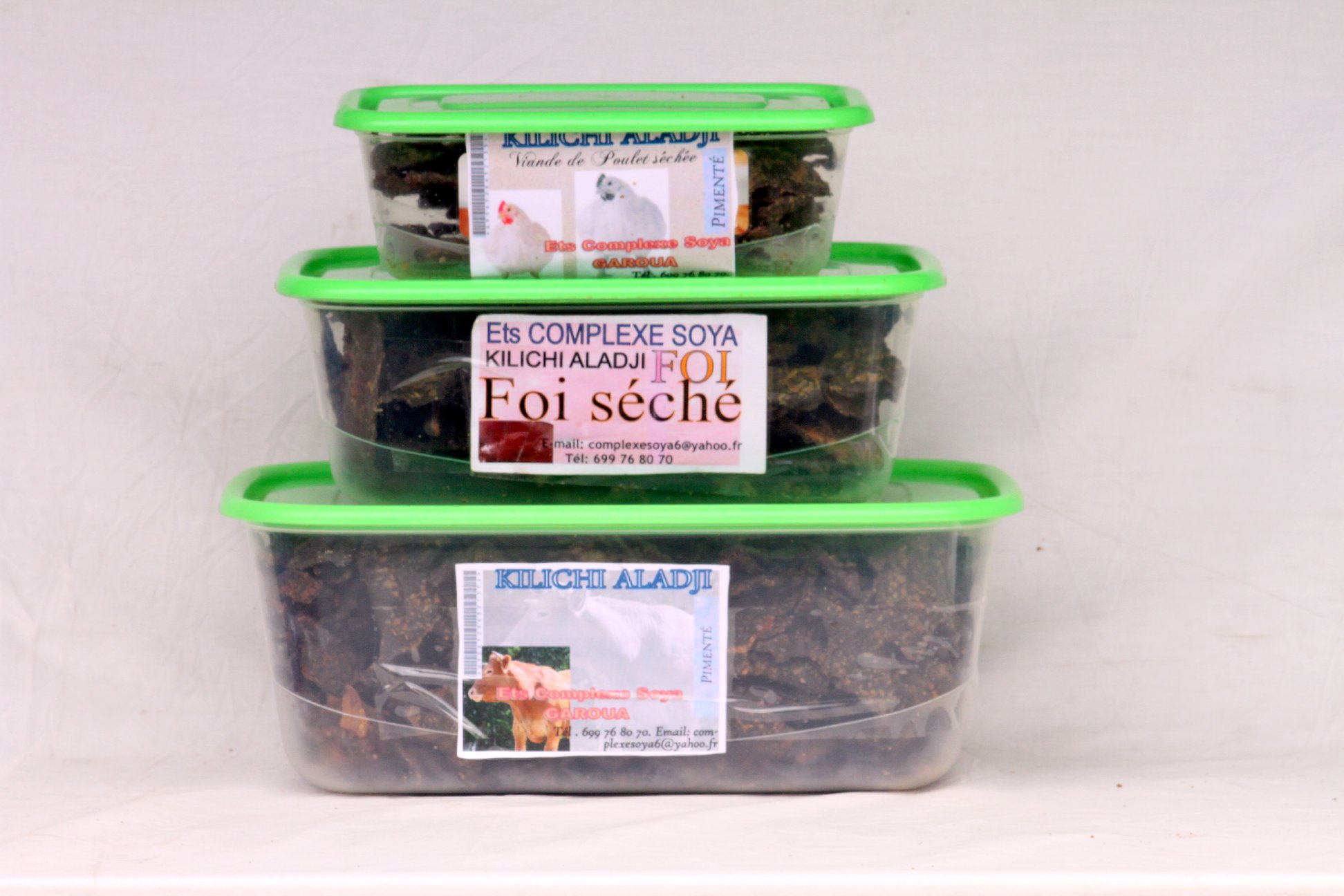 Ets Complexe SOYA est un complexe spécialisé dans la préparation des recettes du grand nord sous la forme kilichi le secret des délices du grand Nord Camerounais. Il offre différents produits séchés au soleil et conditionnés dans des boites en plastiques. Certaines de ses recettes sont faites à base de viande de bœuf, mouton, foie de bœuf, poisson, crevettes, escargot séchés au soleil avec des ingrédients.