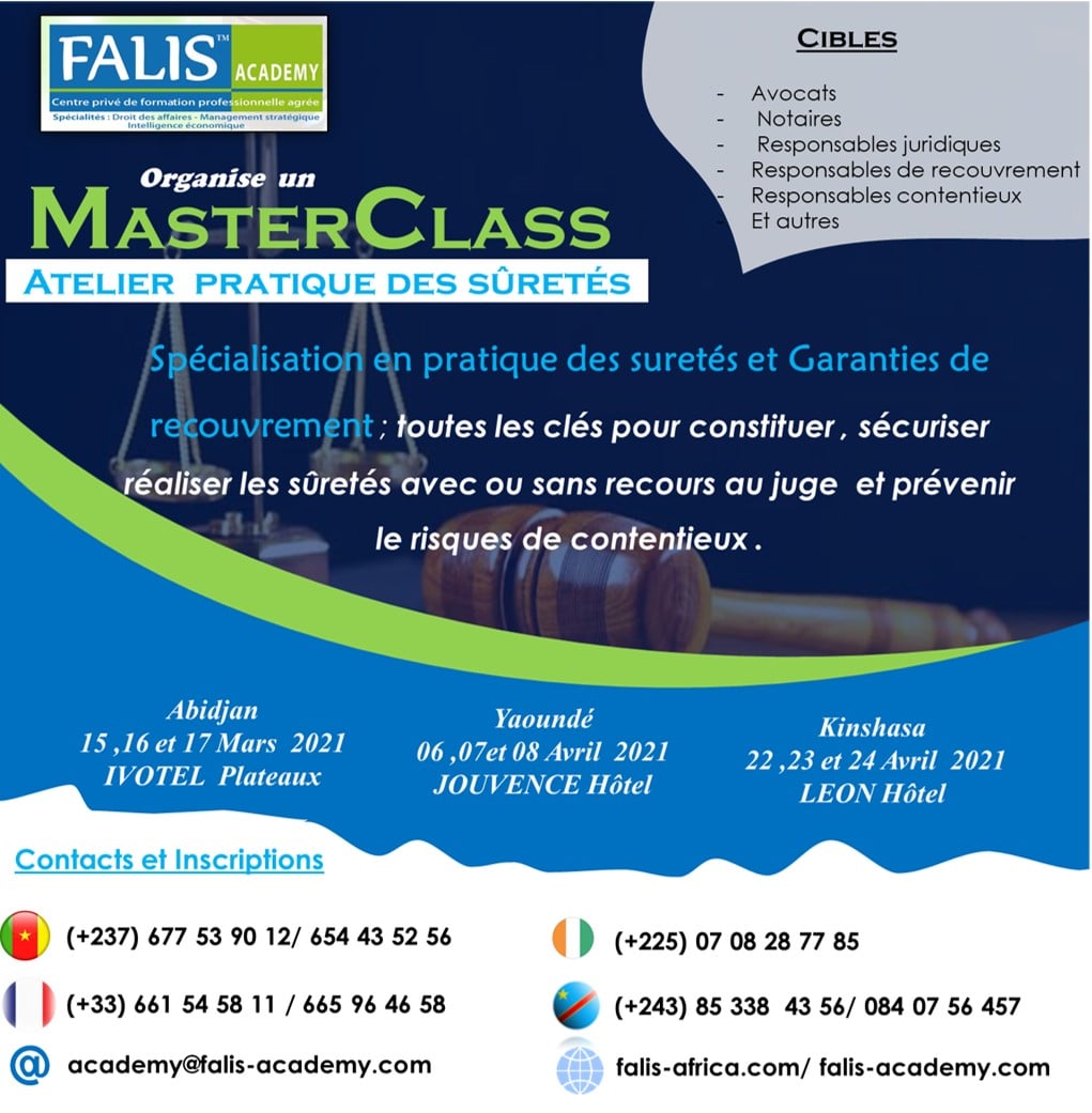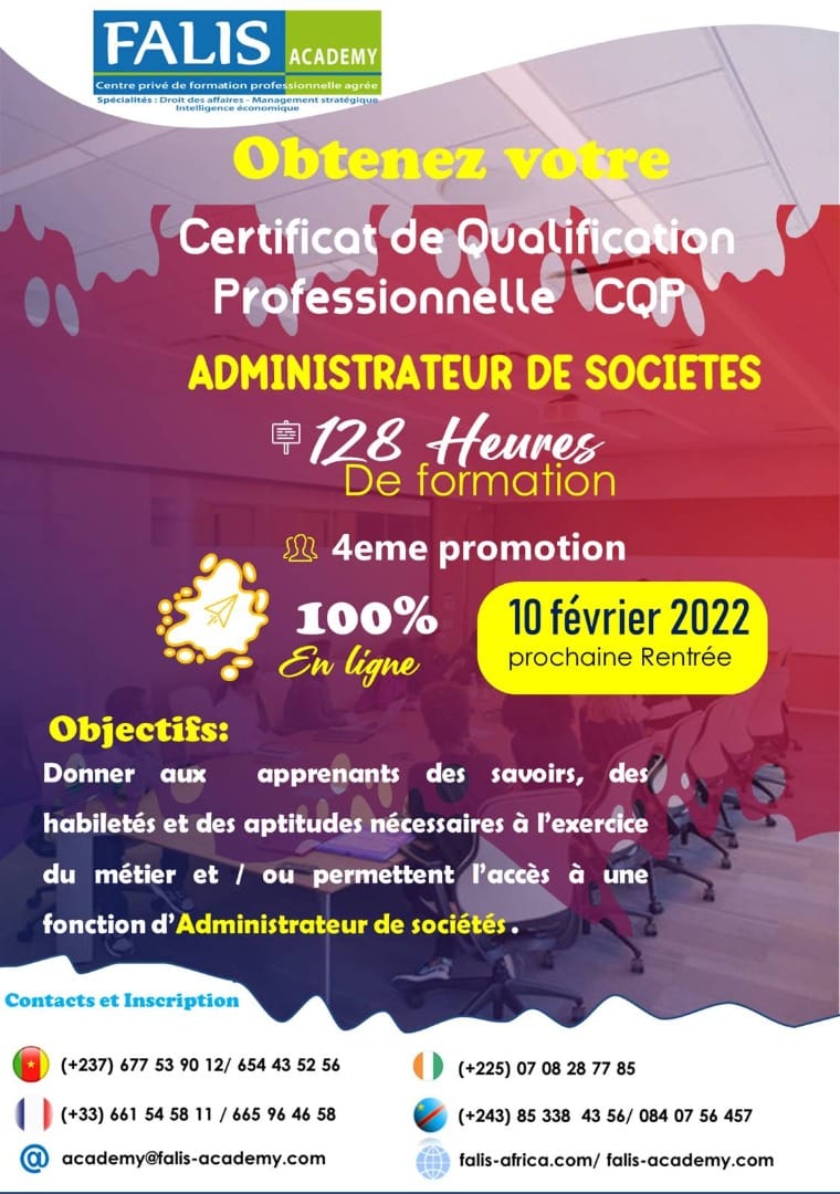 Falis Academy est un centre privé de formation agrée qui appartient au Cabinet FALIS Sas. Falis Academy propose des formations professionnelles et certifiantes dans ses centres de formation à Yaoundé, Kinshasa, Douala, Abidjan, Conakry ou directement dans les entreprises qui le souhaitent. Fort d'une expérience de terrain, Falis Academy s'impose comme l'organisme de formation de référence en droit et pratique des affaires dans l'espace OHADA. Que vous vouliez former vos collaborateurs au sein de votre entreprise (Formation Intra) ou avec des salariés d'autres entreprises (Formation inter), vos étudiants finissants, Falis Academy vous apportera toute son expertise pour répondre à vos besoins de formation. Une équipe de consultants, experts dans leurs domaines, vous accompagne dans la définition et la création de vos besoins de formation. Falis Academy propose également plus de 15 formations certifiantes ayant pour objectifs d'accompagner des salariés, des étudiants et les professionnelles du droit dans l’acquisition et le renforcement de leurs compétences métiers.