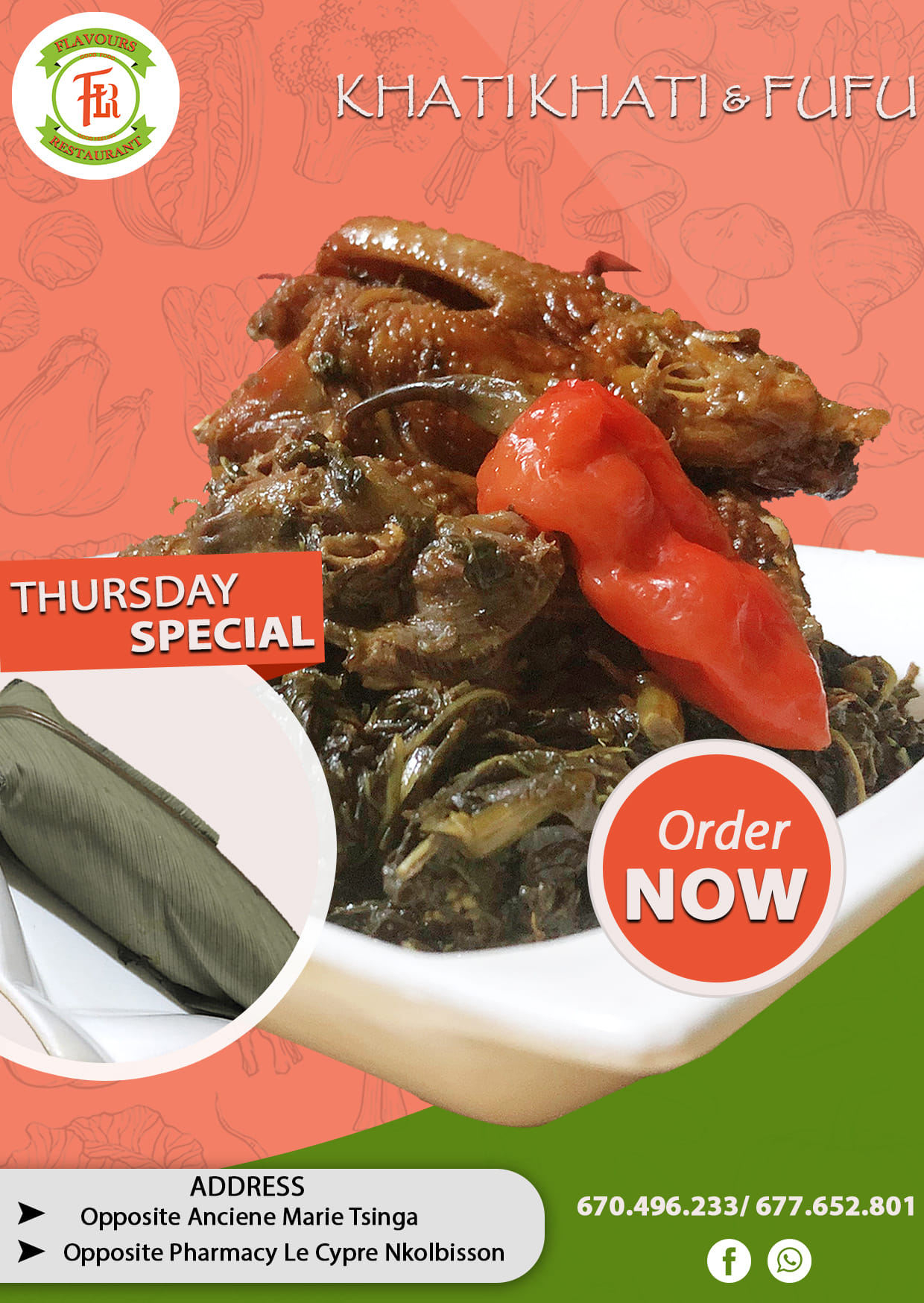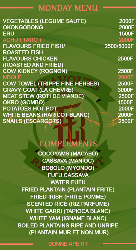 Flavours Restaurant, créée en 2005, se targue aujourd'hui d'une expérience culinaire de plus de quinze ans et d'une spécialisation dans la Cuisine Africaine. Opérant à Yaoundé Cameroun avec deux succursales principales, la succursale mère Flavours Restaurant est située à Tsinga, en face de l'Ancienne Mairie et un nouveau complexe Flavours Restaurant J&S, situé à Nkolbisson en face de la Pharmacie le Cypres. Ayant assumé une position de choix incontestable dans le secteur de la restauration de la ville, le Flavours Restaurant est rapidement devenu un lieu de restauration privilégié. Visitez et voyez par vous-même les tables pleines de plats camerounais authentiques servis dans une ambiance chaleureuse et décontractée. Notre menu propose une variété de plats camerounais appétissants et fraîchement cuisinés. Nous servons ce qui suit : Eru et Waterfufu, Achu, Ndole, Khati Khati, Ekwang, Okongobong, Green Vegetable, Okro, Koki, Mbongo Tchobi, Porridge Cocoyams, Fish, Chicken, Fish etc… Notre appel reste une cuisine maison copieuse qui reste fidèle à la cuisine camerounaise. Notre personnel vous offrira un excellent service à un prix abordable.