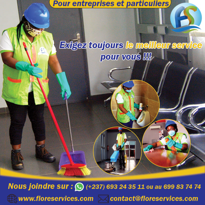 Flore Services est une Entreprise de prestations de services spécialisée dans l’Entretien, le Nettoyage des bureaux, bâtiments, résidences des particuliers, le nettoyage en hauteur et l’assainissement. Flore Services a son siège à Douala, avec une base Technique Juridique et opérationnelle dans diverses villes du pays. Son objectif est de maintenir l’environnement dans un confort hygiénique et agréable.