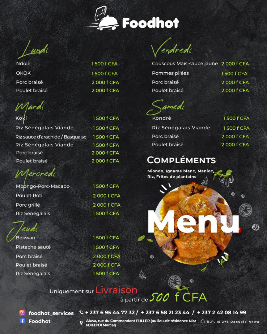 FoodHot est un service de commercialisation et livraison de vivres frais et denrées alimentaires pour particuliers et grossistes d'une part, de plats chauds pour des particuliers et entreprises d'autre part et de boissons naturelles. Des aliments de qualité supérieure à des prix modérés. Vous ne regretterez pas de nous avoir acheté.