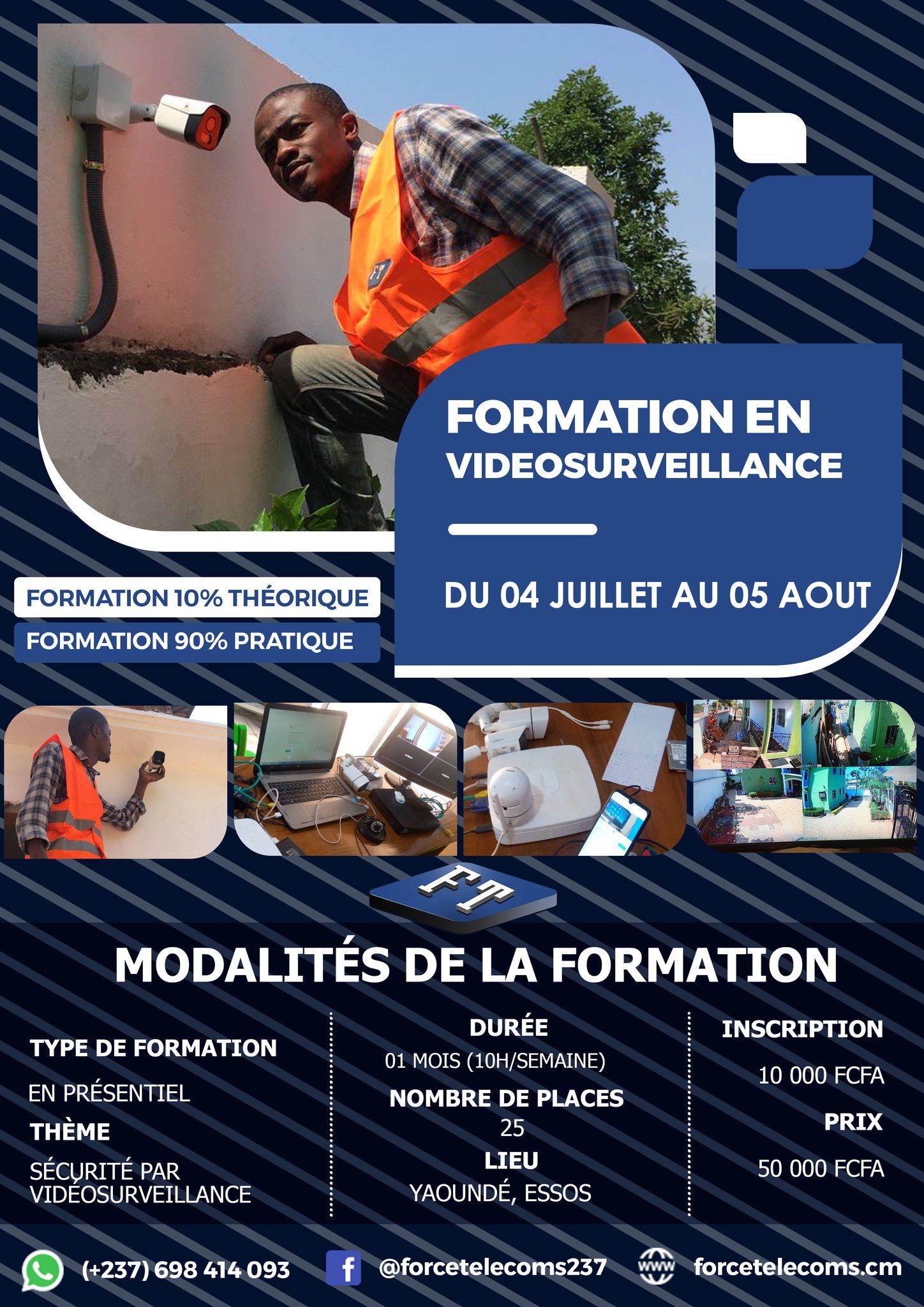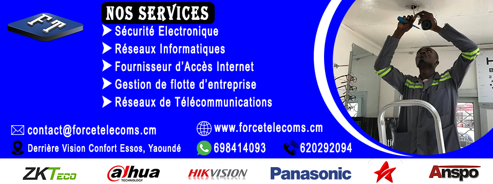 Force Télécoms est une entreprise de prestation de service de télécommunications avec une présence dans le marché Camerounais. Elle est dotée d'une ingénierie à la pointe et spécialisée dans les domaines des nouvelles technologies suivantes : visiophonie, vidéosurveillance, vidéoconférence, téléphonie d'entreprise, système anti-intrusion, sécurité incendie, réseaux informatiques, panneaux solaires, infographie, gestion de présence, développement d'application, contrôle d'accès, antenne parabolique. Nos prestations reposent sur notre savoir-faire et sur nos valeurs. Aucun projet n'est négligeable à Force Télécoms et nous y apportons toujours le même soin, nous garantissons le Service Après-Vente (SAV).