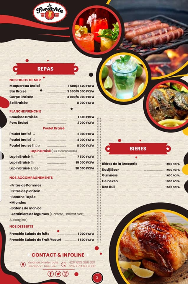 Le Frenchie Food and Lounge est un espace chic aux tendances africaines où vous trouverez des menus incroyables et diversifiés et une gamme variée de grillades comme : saucisses braisés, poulets braisés, lapin braisé, poisson braisé et également un large choix de boissons. Avec un service excellent car le personnel est sympathique et hospitalier, des décorations en matériaux purement africains, une touche sophistiquée et élégante, venez passer des moments inoubliables seul ou en compagnie de vos proches.