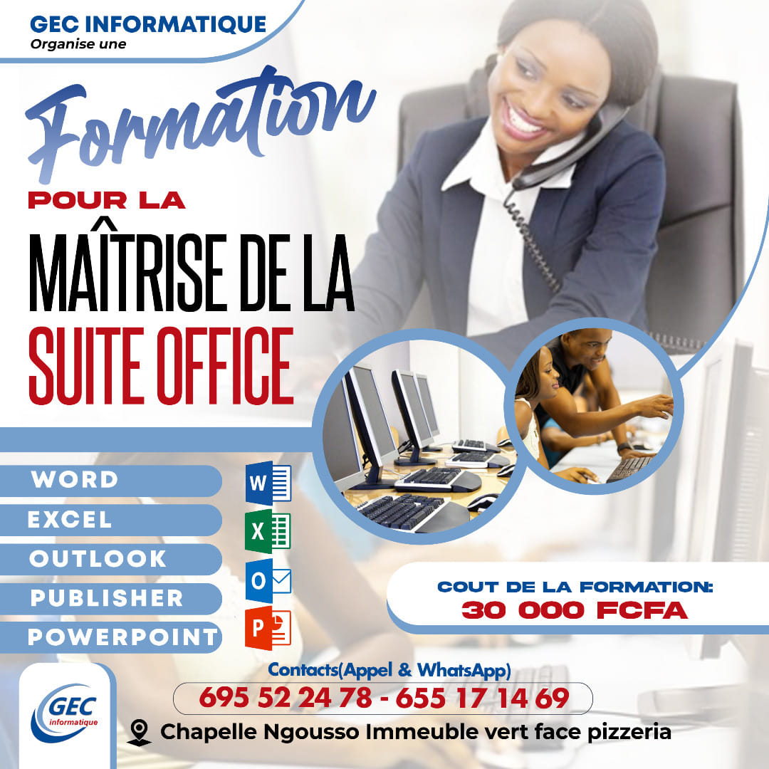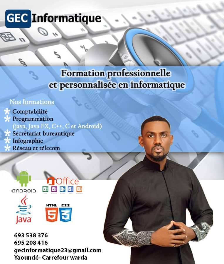 GEC-Informatique est une société camerounaise spécialisée dans la conception, le développement d’applications Desktop, Web et Mobiles ; les prestations de services, les formations entre autres en bureautique, infographie, réseaux informatiques, développement d’applications, comptabilité. Nous vous proposons des formations appliquées, pratiques, interactives et professionnelle.