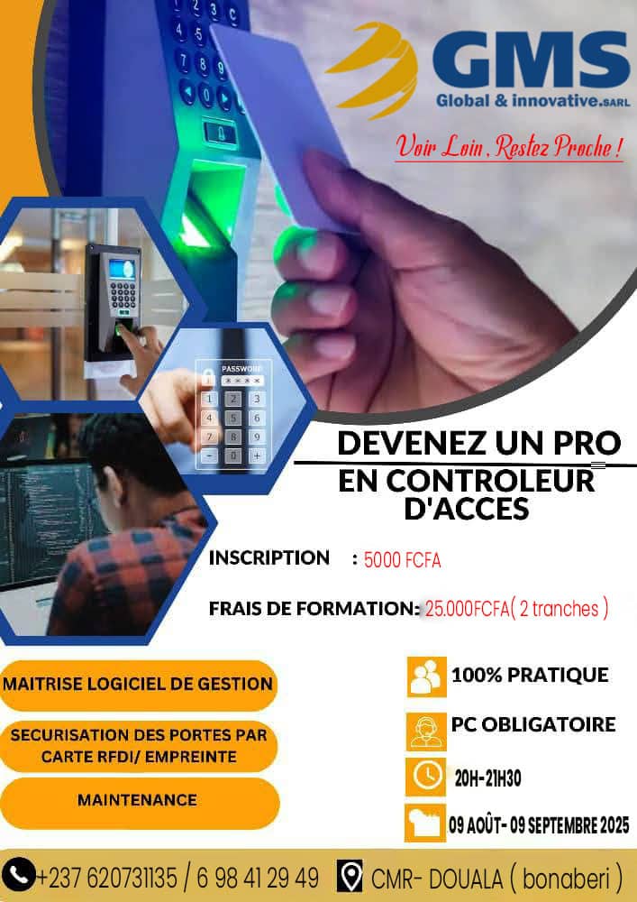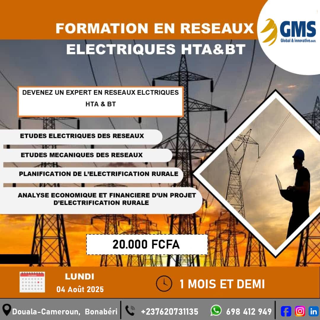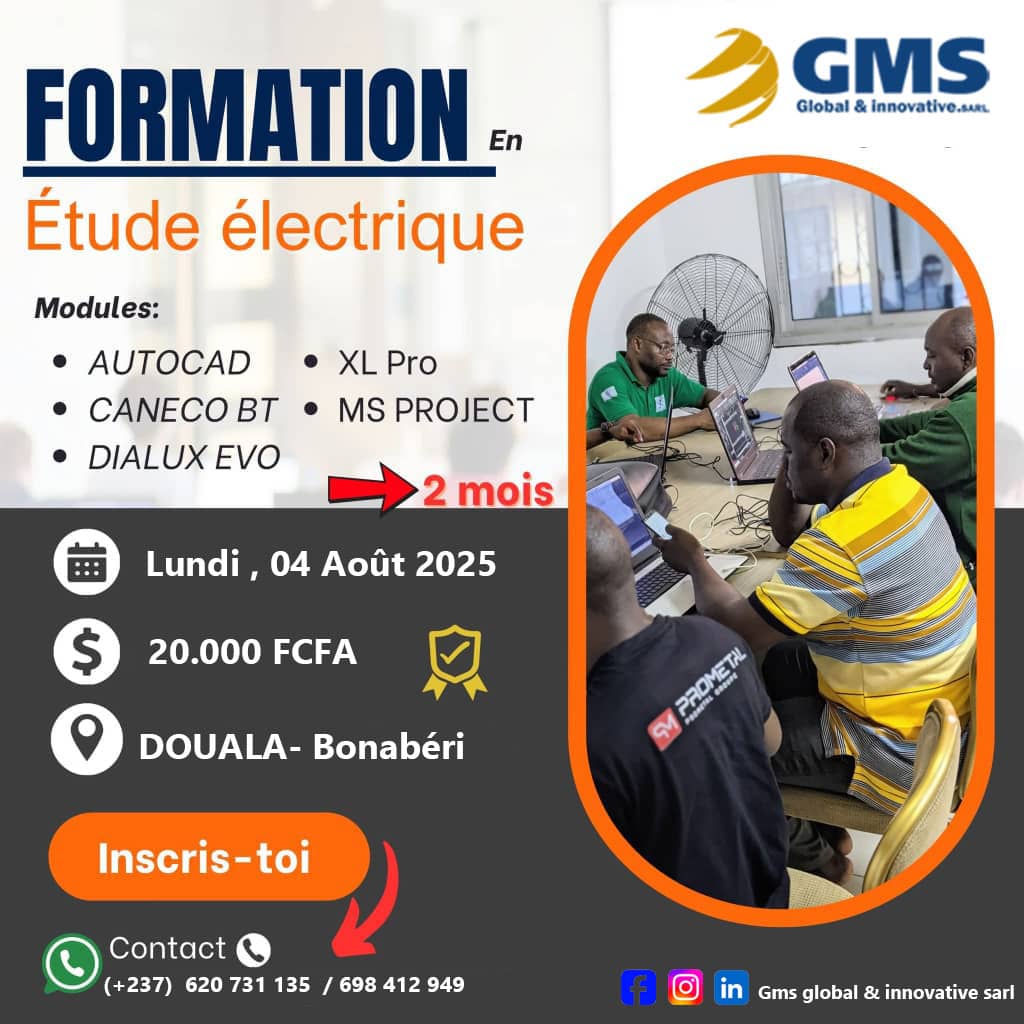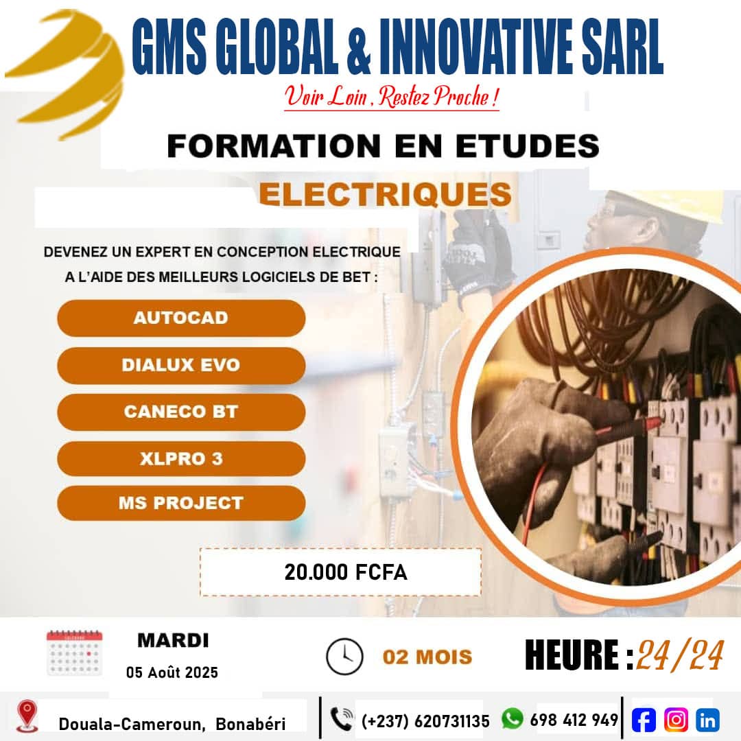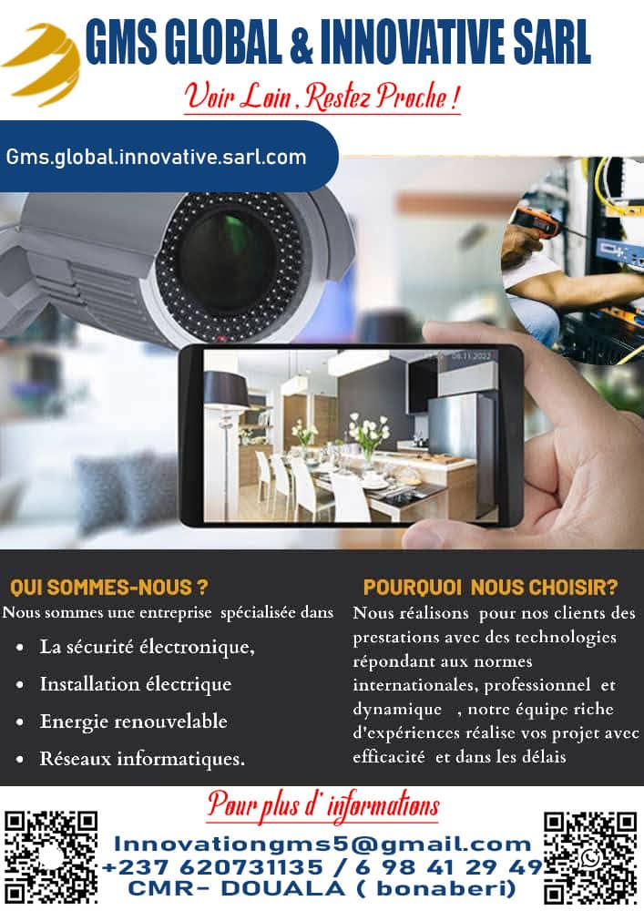 GMS GLOBAL & INNOVATIVE SARL est une entreprise d’ingénierie et de formation spécialisée dans l’électricité Génerale, securité électronique et le BTP . Basée au Cameroun, nous accompagnons particuliers, entreprises et institutions dans la réalisation de projets innovants, la mise en œuvre de solutions techniques fiables et le développement des compétences professionnelles. Notre mission : “Voir Loin, Restez Proche” Nous allions vision stratégique, expertise technique et proximité client pour répondre aux besoins d’aujourd’hui et anticiper les défis de demain. Domaines d’expertise ⚡ Ingénierie / installation électrique : installation, maintenance et optimisation de systèmes électriques 📡 Sécurité électronique et BTP 🎓 Formations professionnelles : modules techniques et pratiques sur mesure 🔌 Solutions énergies renouvelables : solaire, hybrides et autonomes 🛠 Conseil technique & audit : diagnostics, recommandations et supervision de projets Crédibilité- professionnalisme- discipline