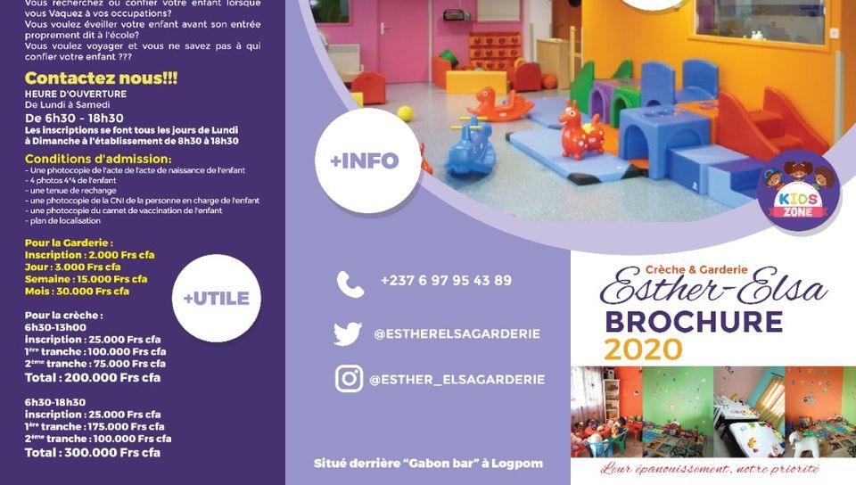 La Garderie et Crèche ESTHER-ELSA est votre espace agréable et convivial pour garder vos enfants de 0 à 3 ans, lorsque vous êtes occupé.e, malade ou alors en déplacement. Notre structure est équipée pour l’épanouissement psychomoteur des tout petits, notamment à travers des activités ludiques, éducatives, une prise en charge nutritionnelle et aussi des dortoirs bien adaptés. Dans notre garderie nous protégeons vos enfants de 6h30 jusqu’à 18h30. Nous tenons compte de leurs habitudes alimentaires, de leurs préférences générales et nous les mettons dans les meilleures conditions. Nous essayons au mieux de les accompagner afin qu’ils se sentent aussi bien que lorsqu’ils sont avec leurs parents. Notre crèche est également une institution scolaire reconnue par les autorités, avec des activités éducatives adaptées aux enfants en bas-âge. Il s’agit d’une école prématernelle où nous apprenons aux bambins à vivre en société et à se préparer à la vie d’écolier. Nous avons un personnel professionnel, consciencieux et surtout motivé. Nous mettons l’accent sur la pédagogie et surtout sur la sécurité des enfants que nous avons à charge. La Garderie et Crèche ESTHER-ELSA est un espace dont la seule priorité restera l’épanouissement de votre progéniture. La garderie ESTHER-ELSA est située à Douala, au quartier Logpom.