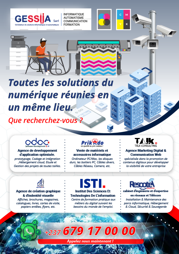 Gessiia Sarl est une entreprise prestataire de services en informatique et automatisme. Nos domaines d'activités sont très variés et s'étendent de la conception ou l'administration réseaux à la production des logiciels spécifique et adapté à la demande du client en passant par la création d'outils graphique (affiche publicitaire, badge, carte de visite, design d'interface graphique, ...) et la maintenance. Nous proposons aussi l'installation et l'administration des logiciels de Gestions. Gessiia Sarl est basée à Douala, au quartier PK8.