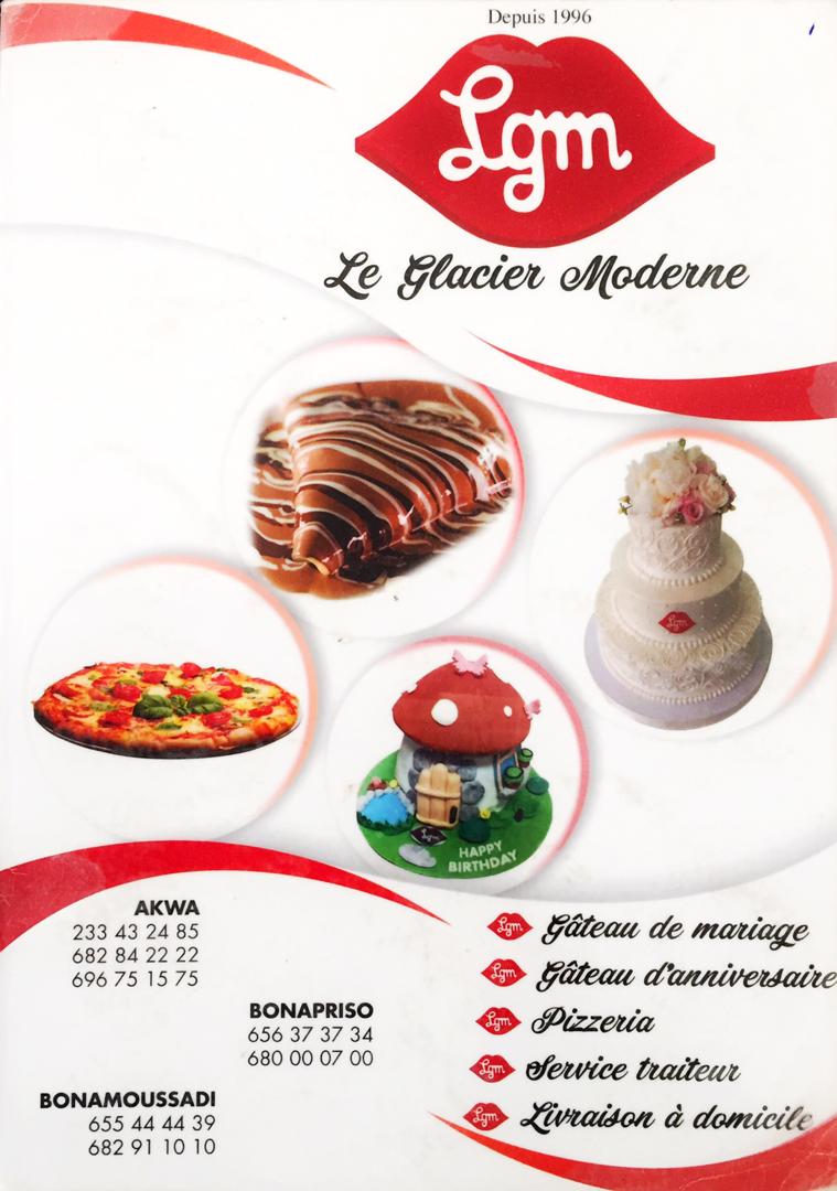 Le Glacier Moderne ou LGM est une franchise française de glaciers implantée à La Réunion et dans plusieurs pays et territoires d'Afrique, tels que le Cameroun et le Sénégal. Le Glacier Moderne (LGM) est un salon de thé, glacier, restaurant, qui vous offre également tout type de viennoiseries. Situé dans les quartiers huppés de la ville de Douala, ce lieu d’un décor somptueux vous accueille avec une ambiance cosy, calme et reposante et un service agréable. Le riche menu du Glacier Moderne vous garantit un plaisir gustatif exceptionnel.