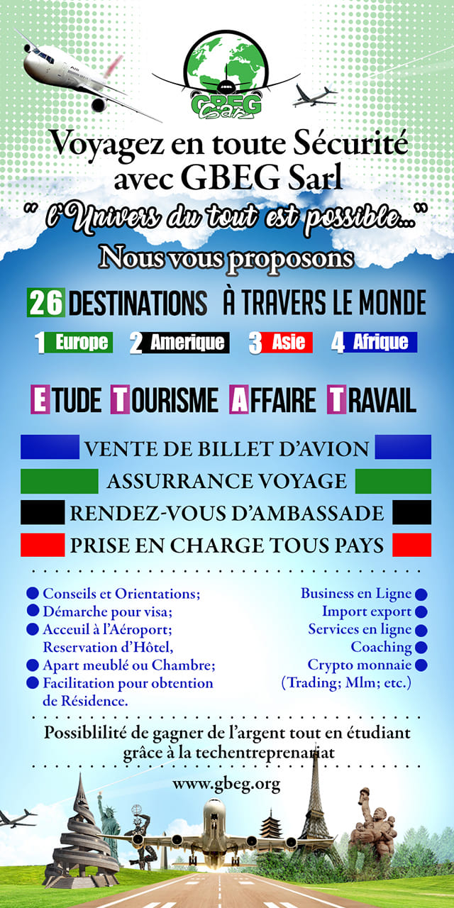 Global Business and Education Group (GBEG) est une entreprise camerounaise spécialisée dans les voyages (voyages d’études, d'affaire, de pèlerinage en Israël, tourisme…), l’économie numérique et l’import – export. GBEG à pour mission de proposer des services ou produits de qualités à couts abordables et aussi de permettre à quiconque de quitter d’un Anybody en Somebody, de l’anonymat au succès de zéro à héro sur le plan relationnel, professionnel, marital, financier, entrepreneurial et enfin éducatif.