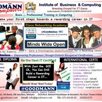 Goodmänn Institute of Business and Computing – GIBC est un établissement d’enseignement supérieur basé à Buea et à Douala. Nous sommes des experts en informatique et des formateurs experts offrant une formation professionnelle et des services dans presque tous les domaines de l'informatique, Réparations d'ordinateurs et d'imprimantes, ventes, mise en réseau, installation de caméras de surveillance, fourniture de services Internet à des sites distants, téléphones IP.
