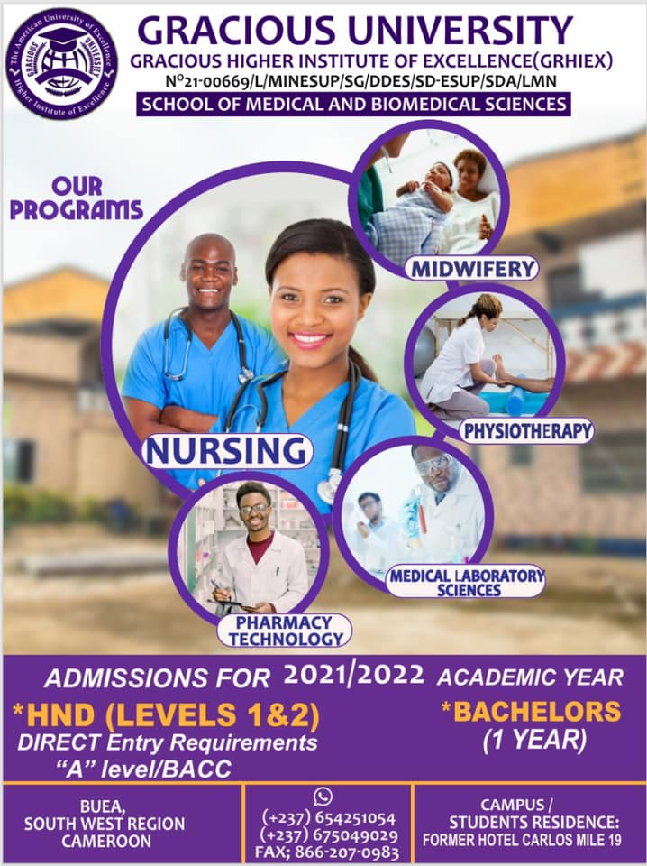 Gracious University est un établissement d’enseignement supérieur basé dans la ville de Buea. Gracious University envisage une communauté d'apprentissage distinctement différente du 21e siècle où la connaissance est jugée digne dans la mesure où elle peut être appliquée par ses diplômés aux solutions immédiates des défis sociétaux critiques, faisant ainsi progresser le plus grand bien mondial. L'institution est engagée dans la formation pédagogique et la réduction de la pauvreté à travers son enseignement de haute qualité, sa recherche, son esprit d'entreprise et en fournissant à ses candidats des compétences qui leur permettent de maximiser leur potentiel.