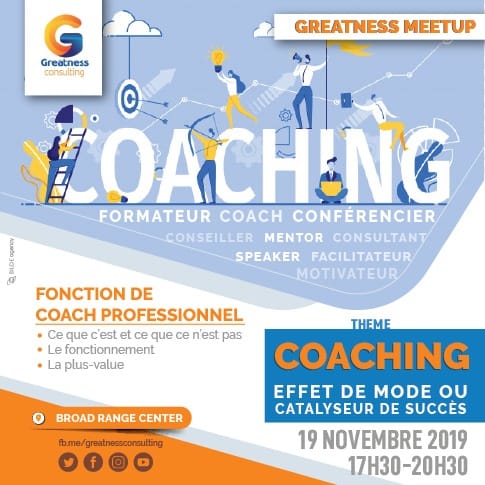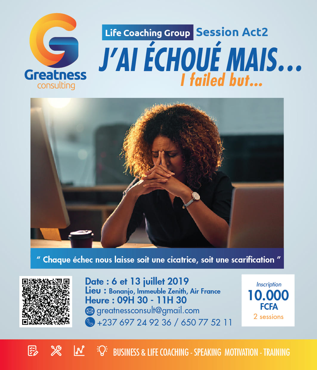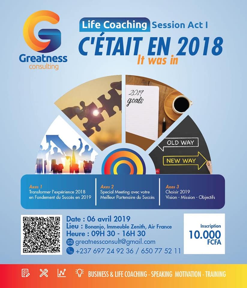 GreatnesS Consulting est un programme de coaching de vie qui permet à tout individu de mettre en place une démarche volontaire d’amélioration de sa vie personnelle ou professionnelle, s’affirmer, appendre à dire non, sortir des conflits, de l’agressivité.«Chaque individu a de la Grandeur en lui et est le Créateur de sa vie ». Nous mettons toute notre Expertise et nos compétences au service du Succès de tous les personnes désireuses d’améliorer leur vie et impacter leur environnement. Ce coaching permet de gérer ses émotions, la colère, peur, tristesse, culpabilité, de communiquer avec efficacité, prendre la parole, dominer sa timidité. Les locaux de GreatnesS Consulting sont situés à Douala, au quartier Bali.