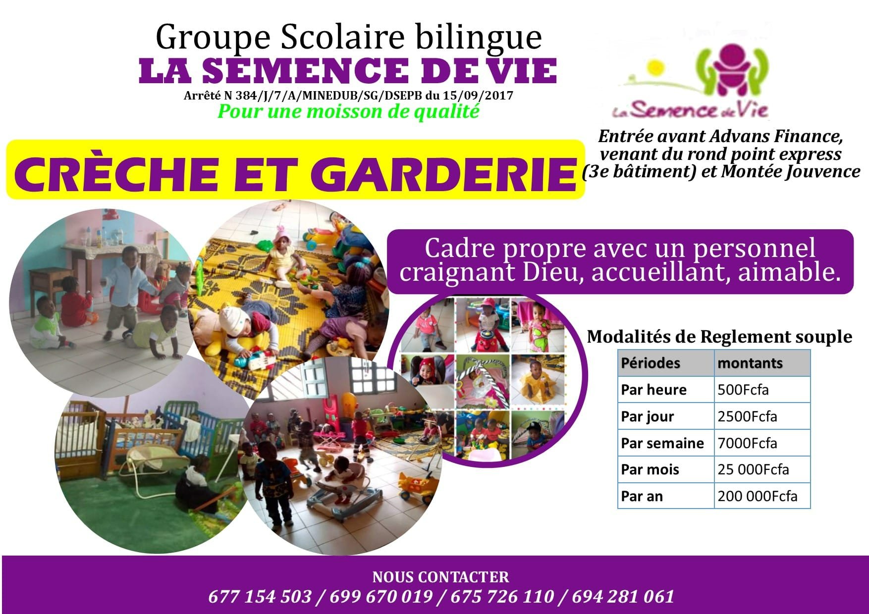 Groupe Scolaire Bilingue la Semence de Vie est une œuvre au Service de Dieu et des nations à travers l'encadrement des enfants et des familles. Elle est un appel à l’encadrement des enfants au travers de l’enseignement scolaire, ceci dans un environnement où la quête de l’excellence, les valeurs morales sont inculquées et le caractère de Christ développé en chaque enfant par des professionnels enseignants ayant acceptés la vision. La spécificité de la vision et de la mission de La Semence De Vie, font d’elle une école aux exigences particulières qu’il faut absolument prendre en compte pour mieux les appréhender et les réaliser. Nous offrons un service de crèche (aux enfants de 3 mois à 3 ans), des enseignements pour les classes de la maternelle au CM2. Et aussi des activités de vacances avec pour thème découvrir Dieu en apprenant une chose, nous amenons les enfants à se découvrir et à découvrir les métiers.