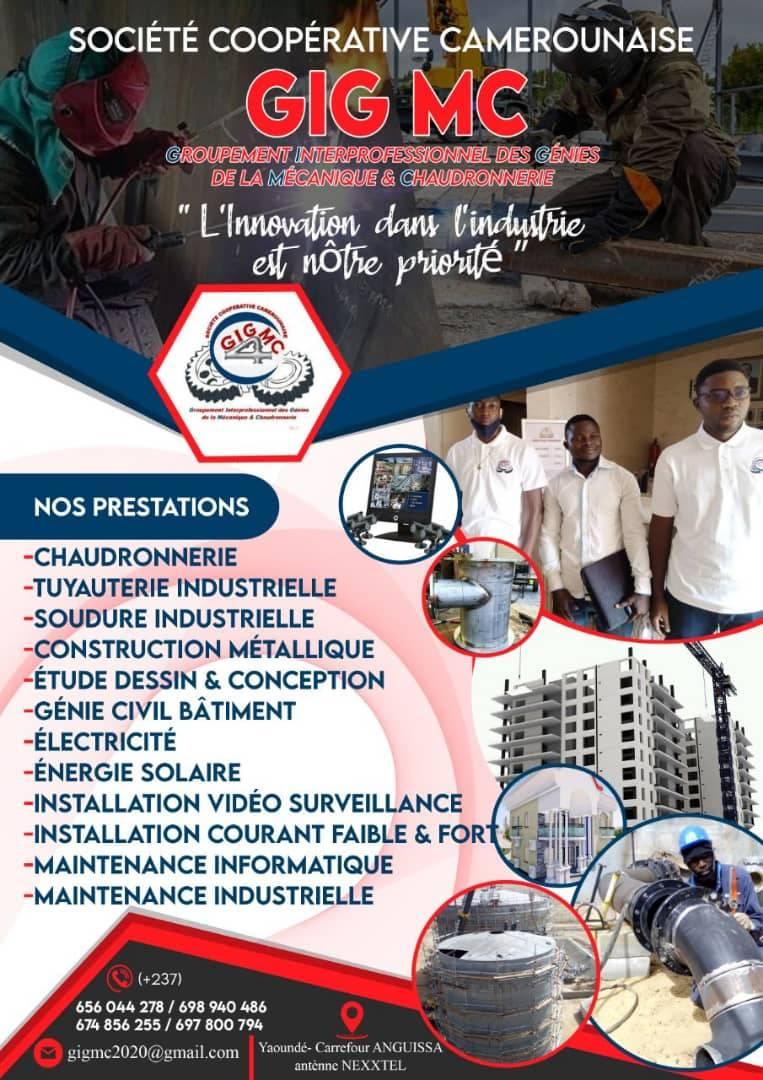 Le Groupement Interprofessionnel des Génies de la Mécanique et de la Chaudronnerie (GIGMC) est un groupe de professionnel qui se donne pour mission d’innover dans le domaine de l’industrie. Le GIGMC offre ses services en chaudronnerie, tuyauterie industrielle, soudure industrielle, construction métallique, génie civil bâtiment, électricité, énergie solaire, installation des vidéos surveillances, maintenance informatique et maintenance industrielle.