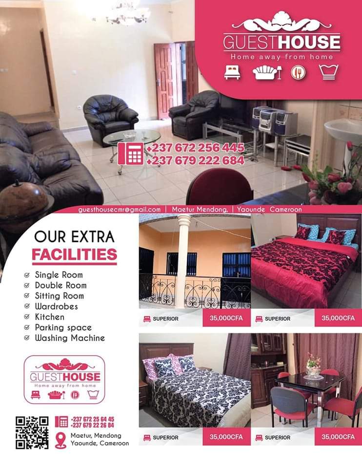 Guesthouse est un établissement d'hébergement situé dans le quartier résidentiel de Maetur à Mendong Yaoundé. Parfait pour les voyageurs et la famille, L'établissement est construit spécialement pour offrir un maximum de confort aux personnes et aux familles souhaitant passer du temps de qualité. Le Guesthouse est fier d'être un hébergement de classe et pratique et vous offre une expérience que vous n'oublierez jamais.