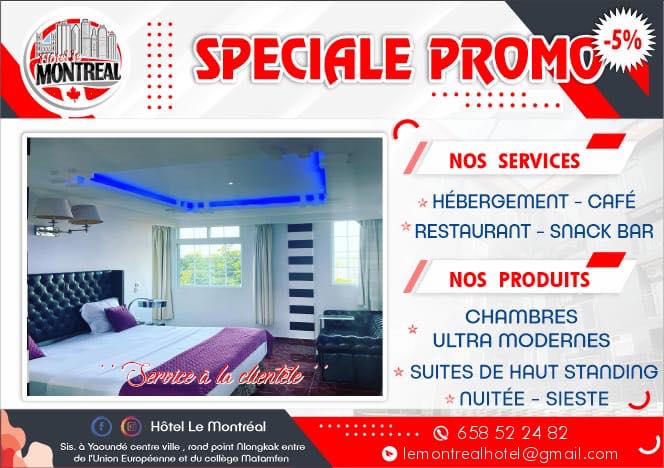 Situé à Yaoundé centre-ville, Hôtel Le Montréal met à votre disposition des chambres ultramodernes et suites de haut standing avec une vue panoramique à vous couper le souffle. Vous bénéficiez d’un accueil chaleureux grâce à une réception ouverte 24H/24 et 7J/7. Les chambres comportent une télévision à écran plat, un bureau, un coffre-fort, un réfrigérateur, une armoire et une salle de bain avec douche privative. Hôtel Le Montréal est doté d’un café, snack bar et d’un restaurant où vous pouvez raffoler des mets concoctés, par des experts culinaires d’ici et d’ailleurs. Un service traiteur vous accompagne lors de vos événements.