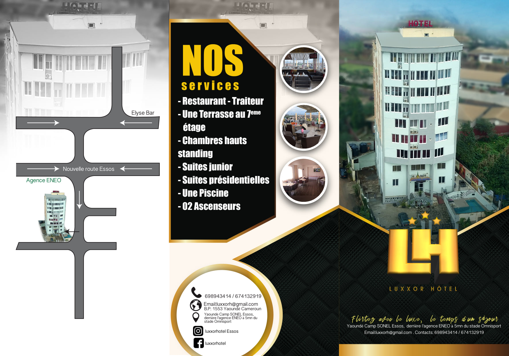 Le Luxxor Hôtel est un établissement hôtelier classé 3 étoiles situé dans la ville de Yaoundé au camp Sonel Essos. Le Luxxor Hôtel propose une terrasse bien exposée, une vue sur la piscine et un bar. Le parking privé sur place est gratuit. Toutes les chambres disposent de la climatisation et d'une télévision par satellite à écran plat. Certaines présentent un coin salon, idéal pour vous détendre après une journée bien remplie. Plusieurs s'ouvrent sur une terrasse ou un balcon. Vous profiterez d'une connexion Wi-Fi gratuite dans l'ensemble des locaux. L'établissement assure un service de navette gratuit.