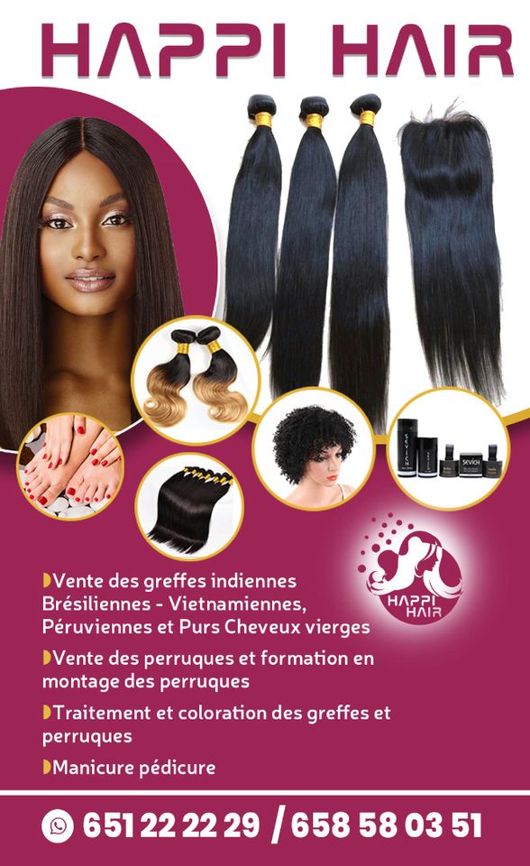 Happi Hair est une boutique en ligne qui offre des services à savoir : Vente des greffes indiennes, brésiliennes, vietnamienne, péruviennes, formation de montage de perruques, traitement et coloration des greffes et perruques, manucure, pédicure.