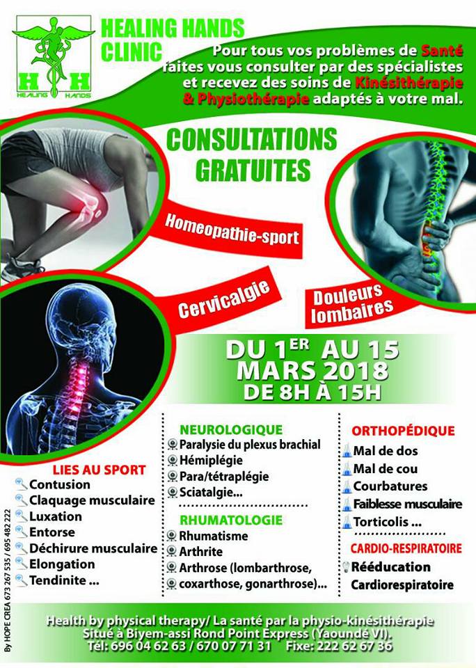 - Healing Hands est une clinique spécialisée en physio/kinésithérapie située au rond point express à Biyem Assi (Yaoundé)