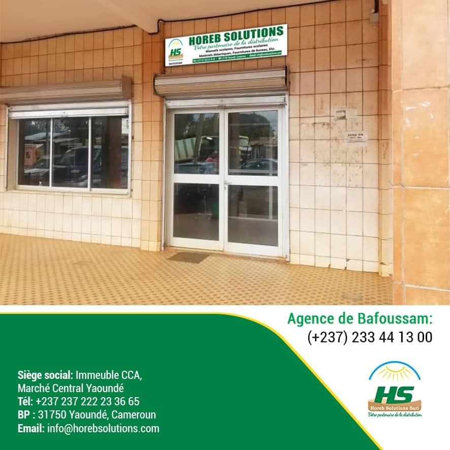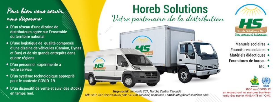 Horeb Solutions Sarl est une entreprise récemment créée pour combler les lacunes et les défaillances observées dans le secteur de la distribution au Cameroun notamment dans le domaine des manuels scolaires, des fournitures scolaires, des fournitures de bureaux… Conscient de cette nécessité de distribuer vos produits sur l’ensemble du territoire national, nous avons mis à votre disposition un réseau de distribution et de partenaires présents dans les dix régions. Horeb Solutions est doté de six grands entrepôts dans quatre régions, d’un parc automobile composé d’une dizaine de véhicules (camion, dynas, fourgonnettes), d’une équipe dynamique prête à vous servir, d’une plateforme technologique de pointe pour faciliter la distribution de vos produits sur toute l’étendue du territoire national.