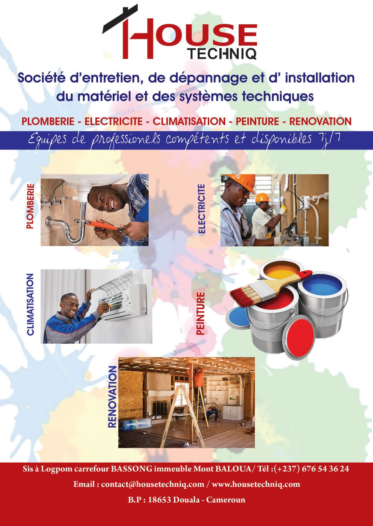 House Techniq est une entreprise spécialisée dans la vente des matériels de construction mais aussi dans divers domaines : Construction et maintenance des bâtiments, Sécurité et système d’alarme ,Téléphonie, Réseaux informatiques et Télécommunications électricité, plomberie, froid et climatisation, peinture et rénovation. Elle met à votre disposition ses équipes de professionnels pour des interventions 7j/7 et 24h/24.