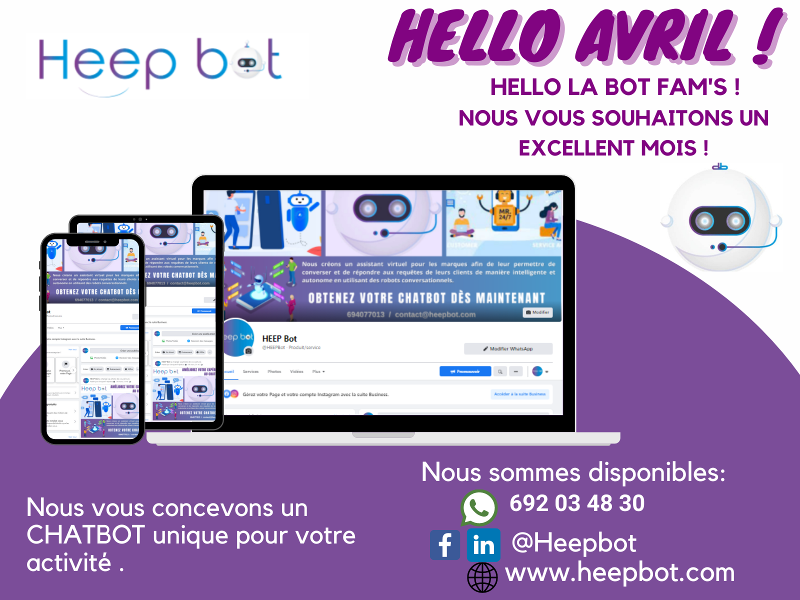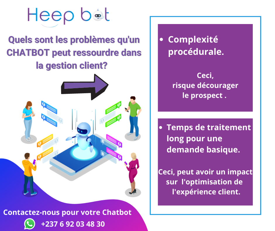 Human, Empathic, Enthralling and Personnalize Bot (HEEP BOT) est une startup spécialisée dans l’intelligence conversationnelle qui aide les entreprises à optimiser la proposition de leurs services via les plateformes de messagerie sociale en automatisant leur support conversationnel par des chatbots. Nous créons un assistant virtuel pour les marques pour leur permettre de converser et de répondre aux requêtes de leurs clients de manière intelligente et autonome en utilisant des robots conversationnels. HEEP BOT prend en charge vos projets de chatbots à partir de zéro. Bénéficier des conseils techniques de nos experts qui vous proposent la meilleure solution de chatbot et les plateformes de messagerie adaptées pour booster votre productivité et optimiser votre rendement.
