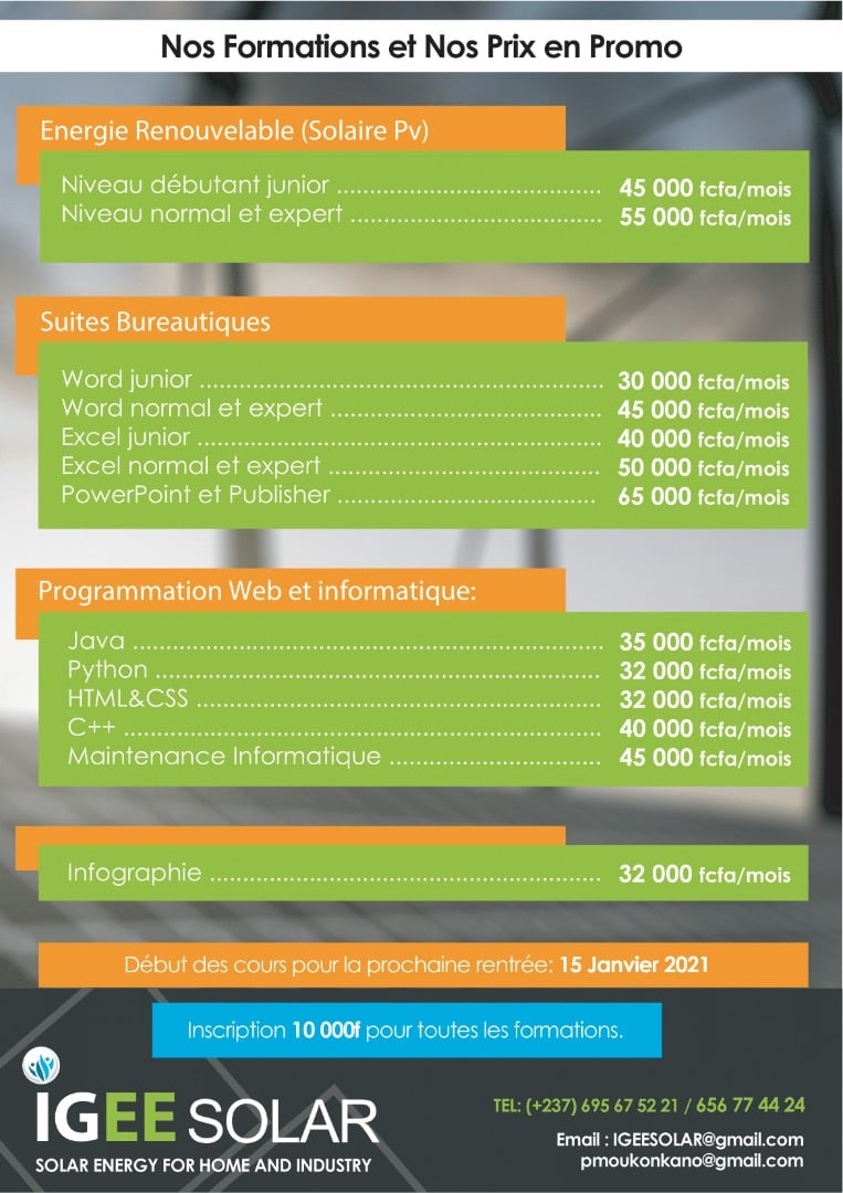 IGEE Solar Energy est une entreprise de prestations de services dans le domaine des énergies renouvelables (Solaire, Biogaz), de l’informatique et de formations professionnelles. Nos services sont : Installation des panneaux solaires, services informatiques, formation en énergie renouvelable, formation en secrétariat bureautique, formation en programmation web, formation en informatique, formation en infographie, froid et climatisation, maintenance informatique, services de vidéo surveillance, installation électrique et maintenance électrique.