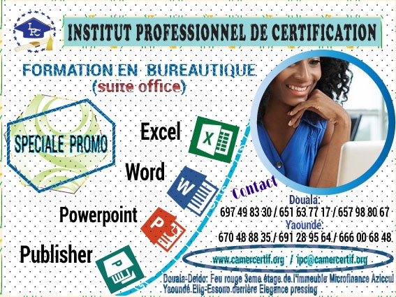 L’Institut Professionnel de Certification (IPC) est un institut professionnel agréé à dispenser les formations professionnelles, les certifications internationales ; le recyclage du personnel d’entreprise, des hommes d’affaires et des étudiants. Nous permettons à nos étudiants et clients de renforcer leur potentiel d’emploi, de booster leur carrière actuelle et future, d’élargir leur champ d’action et d’accentuer leurs connaissances opérationnelles. Notre principale mission est de répondre à la demande du marché local et international en formations professionnelles et Certifiantes. Pour y parvenir, l’IPC se présente comme étant un partenaire privilégié de part l’expérience et le dynamisme de son équipe de formation constitué des académiciens, des professionnels et des certifiés dans tous ses deux campus de Douala et de Yaoundé).