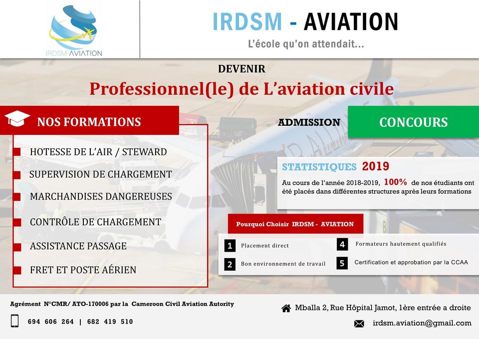 Situé dans la ville de Yaoundé, au quartier Mballa II, rue hôpital Jamot, 1ère entrée à droite, l’Institut Régional Direct Services Management Aviation (IRDSM-Aviation) est un centre de formation privé crée par le Groupe DSM dans le but d’offrir des formations dans certains domaines de l’aviation civile. Pour le cas échéant: Agent Assistance au sol (Fret, Assistance passage sol, Contrôle de chargement, supervision de chargement…); Sureté de l’aviation civile et Personnel Navigant de Cabine. Ces formations ont été accordées par la CCAA qui a jugé l’école apte et suffisamment outillée pour encadrer dans les domaines sus évoqués. L’école s’appuie sur trois piliers qui représentent ici sa devise à savoir : Rigueur – Professionnalisme – Excellence.
