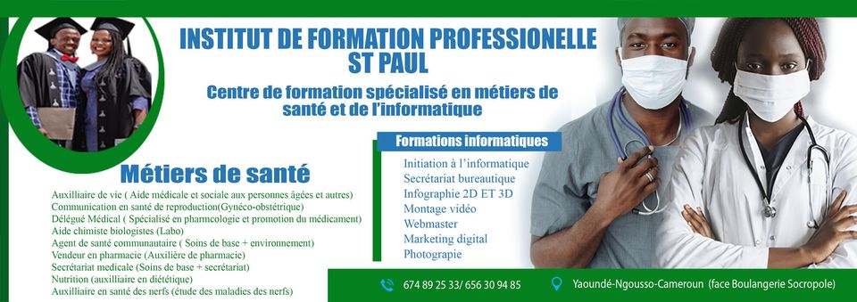 L'Institut Saint Paul est un institut de formation aux métiers de santé et de l'informatique. À l'Institut Saint Paul, les métiers de la santé regroupent les auxilliaires de vie, les délégués médicaux, les sécretaires médicaux, les agents de santé communautaire, les vendeurs en pharmacie ou encore les aides chimites/biologistes (laboratoire). Quant aux métiers de l'informatique, le centre propose des formations en Secrétariat bureautique, l'infographie, le marketing digital, le montage video ou encore la photographie. L'Institut Saint Paul est situé à Yaoundé, au quartier Ngousso.